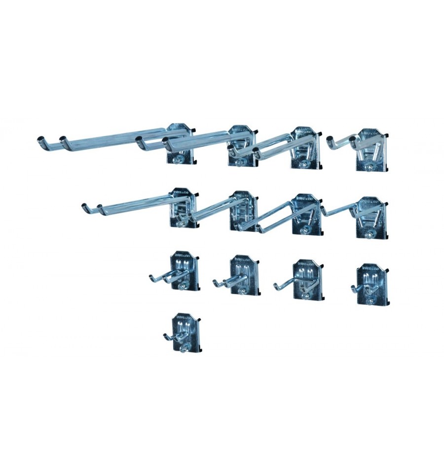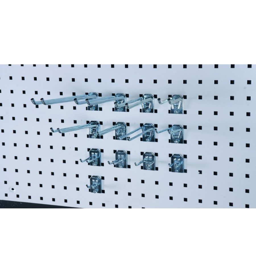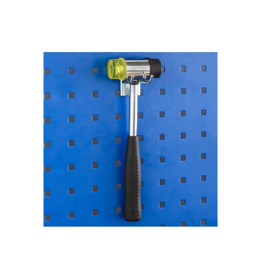 Podwójny hak do zawieszania różnych narzędzi uderzających. Ocynkowany. Hak pasuje do perforowanych paneli narzędzi, gdzie jest zaczepiany w perforacji płyty i blokowany śrubą ograniczającą.