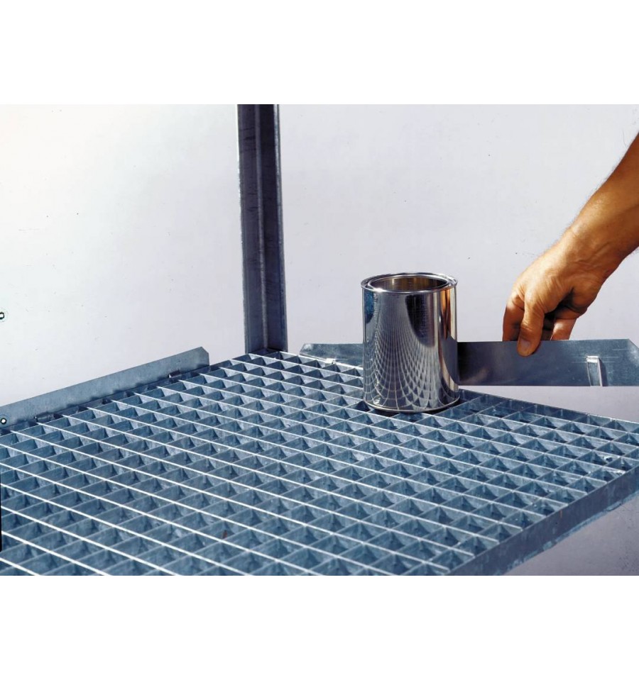 Element stanowi uzupełnienie wyposażenia wanien wychwytowych i krat stalowych, poprawiając bezpieczeństwo pracy z substancjami niebezpiecznymi. Produkt dostarczany w częściach, przeznaczony do zastosowania w środowisku przemysłowym i magazynowym.