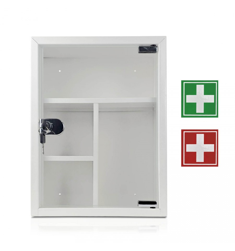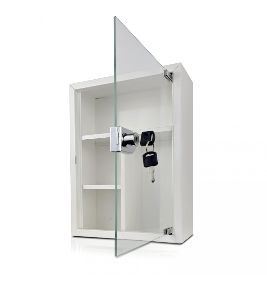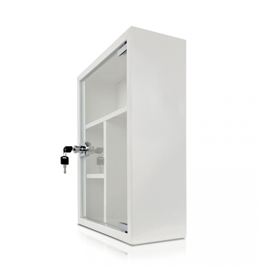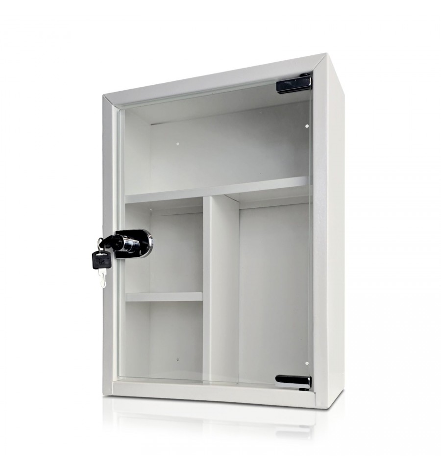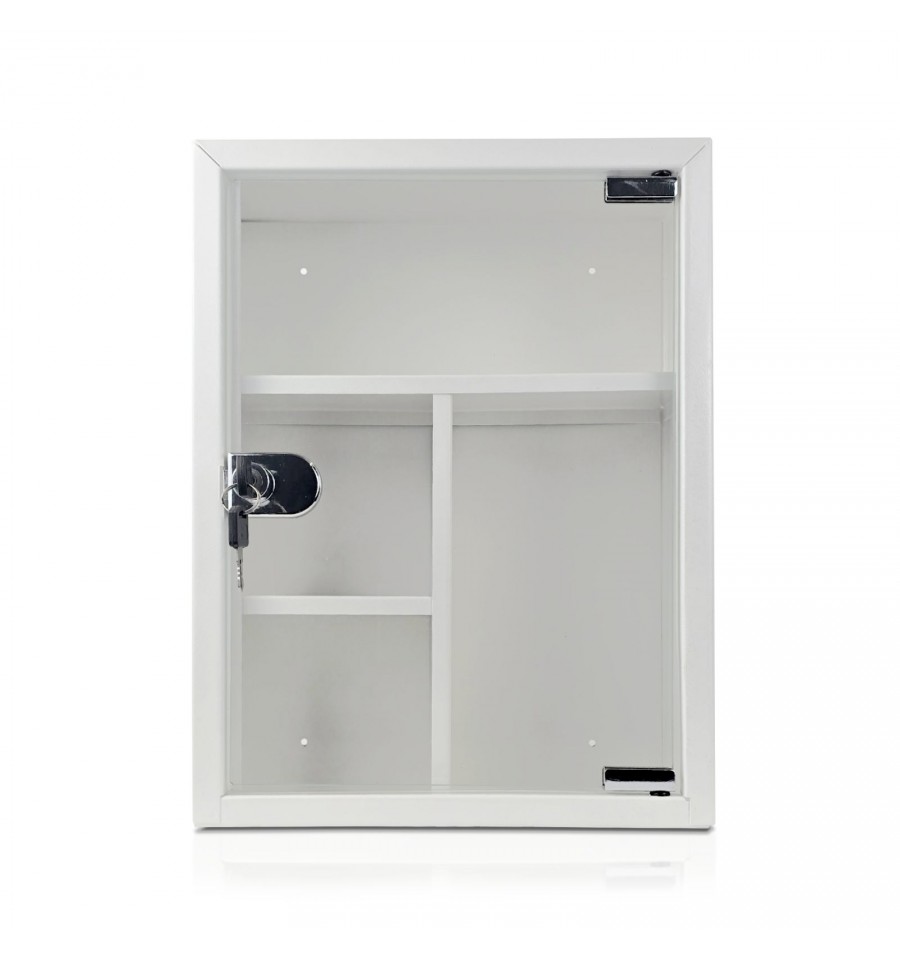 Ścienna metalowa apteczka ze szklanymi drzwiczkami (biała) wykonana jest z blachy stalowej. Kompletny zestaw: 2 półki są stałe, bez możliwości regulacji wysokości. Istnieje możliwość przymocowania do ściany lub postawienia na blacie, drzwi są szklane 4 mm, zamykane na zamek. Powłoka ramy-poliestrowa. Zamykana na klucz.