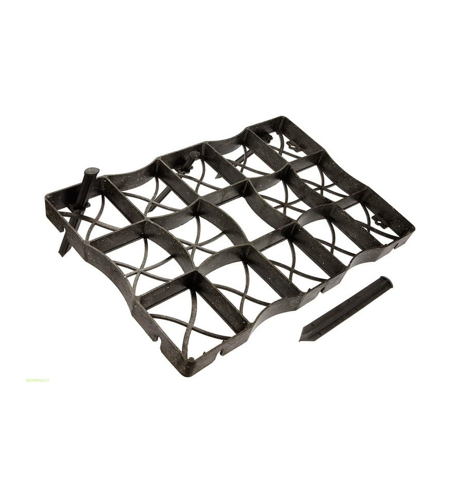Do montażu krat niezbędne są elementy montażowe - kotwy z tworzywa, przy piaszczystych podłożach geoPEG 50 lub przy bardzo twardym podłożu metalowe gwoździe geoNAIL Na czas wschodu trawy zaleca się przykrycie nawierzchni fizeliną aby zabezpieczyć nasiona przed wymywaniem i ptakami.