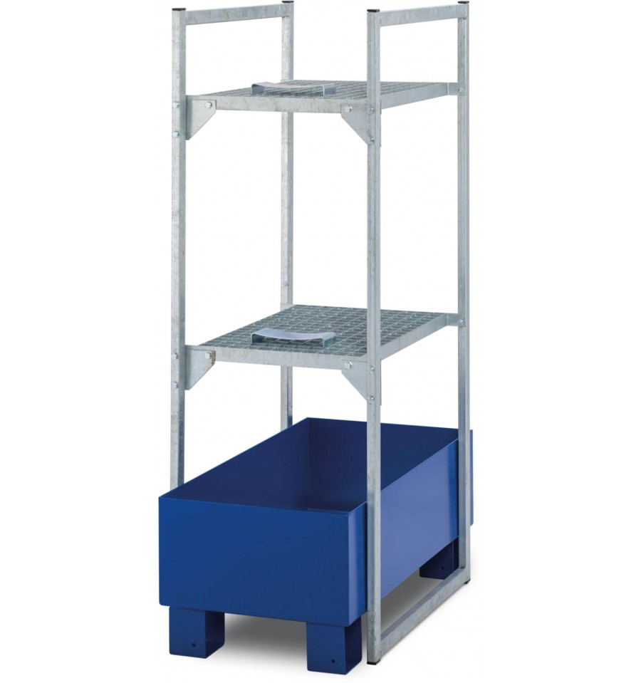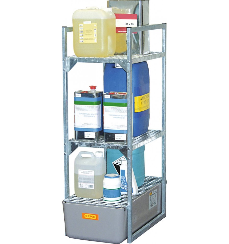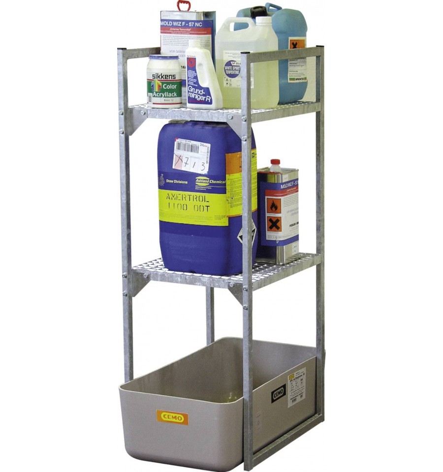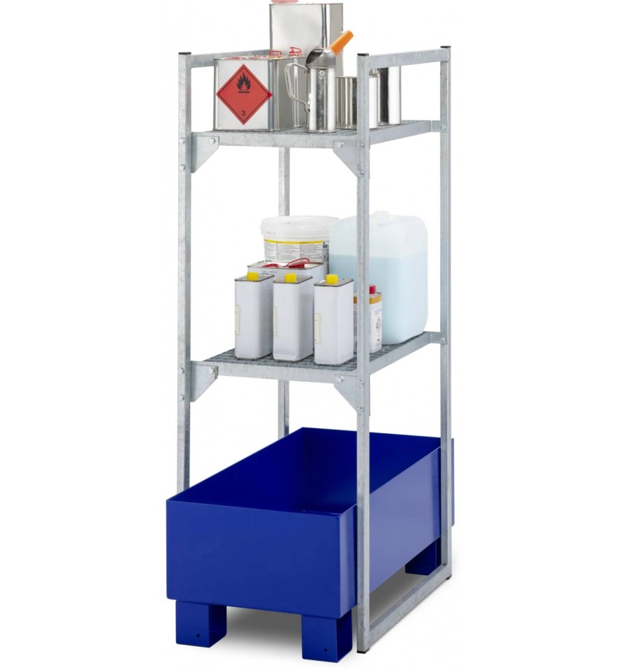 Regał na substancje niebezpieczne z wanną wychwytową przeznaczony jest do bezpiecznego magazynowania mniejszych pojemników, kanistrów oraz opakowań zawierających substancje wodno- i środowiskowo niebezpieczne. Konstrukcja wykonana jest z ocynkowanej stali zapewniającej wysoką stabilność i trwałość, a wersja z wanną wychwytową z GFK posiada ogólną aprobatę budowlaną DIBt Z-40.12-227. Produkt przeznaczony jest do użytkowania wewnątrz pomieszczeń (Indoor).