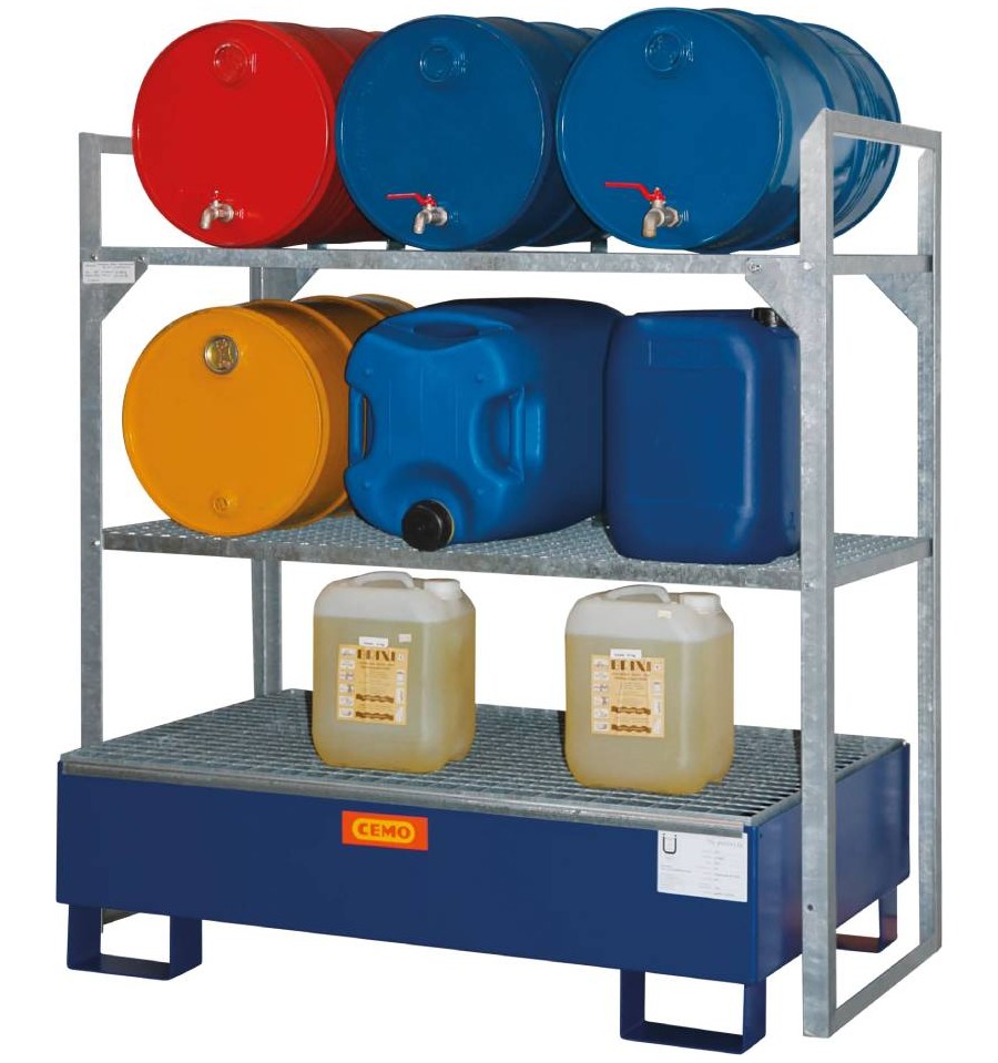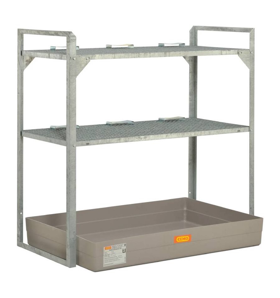 Regał na substancje niebezpieczne z wanną wychwytową przeznaczony jest do bezpiecznego magazynowania mniejszych pojemników, kanistrów oraz opakowań zawierających substancje wodno- i środowiskowo niebezpieczne, a także jednej beczki o pojemności 60 l. Konstrukcja wykonana jest z ocynkowanej stali zapewniającej wysoką stabilność i trwałość, a wersja z wanną wychwytową z GFK posiada ogólną aprobatę budowlaną DIBt Z-40.12-227. Produkt przeznaczony jest do użytkowania wewnątrz pomieszczeń (Indoor).