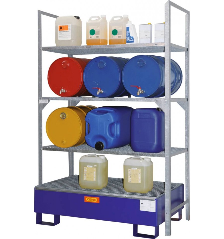 Regał umożliwia bezpieczne przechowywanie beczek, kanistrów i pojemników z olejami, paliwami, chemikaliami, kwasami czy ługami. Wbudowana wanna wychwytowa skutecznie zbiera ewentualne wycieki, chroniąc powierzchnię magazynową i środowisko. Ocynkowana konstrukcja zapewnia wysoką trwałość oraz odporność na korozję w wymagających warunkach przemysłowych, a solidne poziomy składowania gwarantują bezpieczne użytkowanie nawet przy dużych obciążeniach.