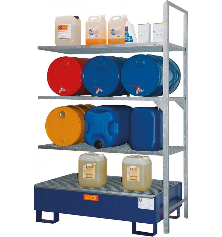 Dostawka umożliwia rozbudowę regału podstawowego i zwiększenie przestrzeni magazynowej. Pozwala na bezpieczne składowanie kanistrów oraz mniejszych pojemników z olejami, olejem przepracowanym, kwasami, ługami, paliwami czy innymi substancjami niebezpiecznymi. Konstrukcja umożliwia przechowywanie do 6 beczek 60 l lub ich kombinacji z mniejszymi pojemnikami. Kilka poziomów składowania zapewnia wygodną organizację przestrzeni magazynowej, a wbudowana wanna wychwytowa umożliwia bezpieczne gromadzenie ewentualnych wycieków.