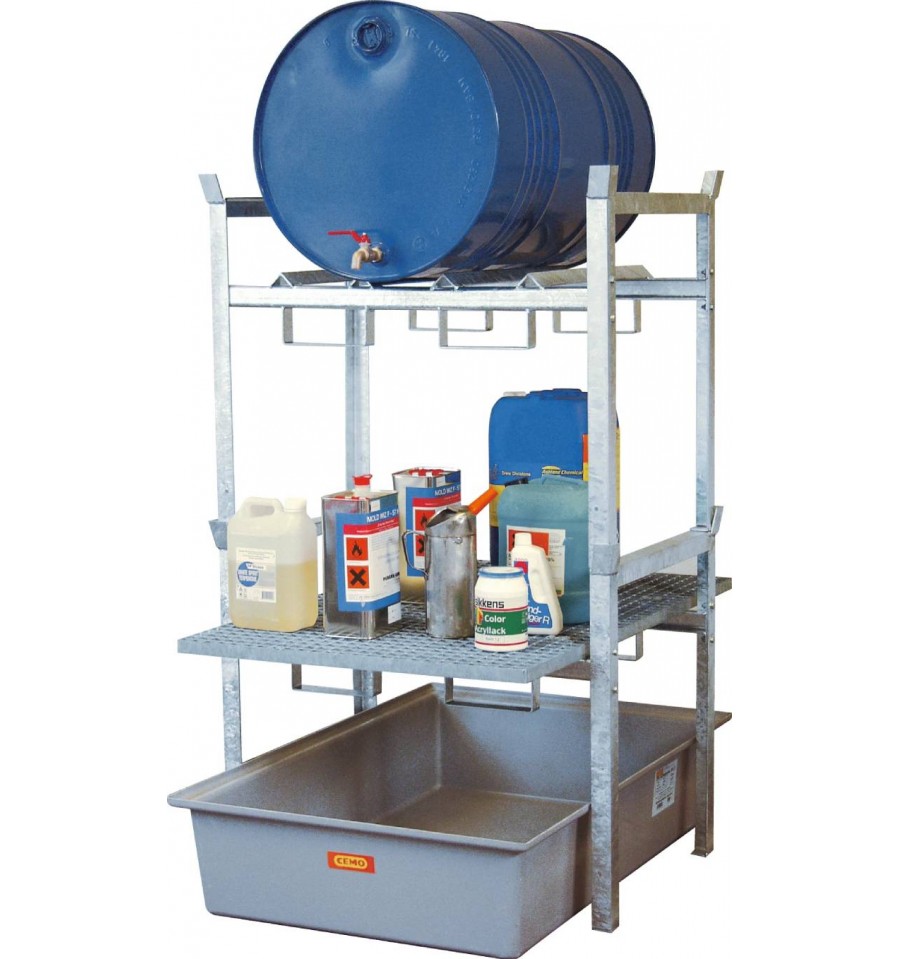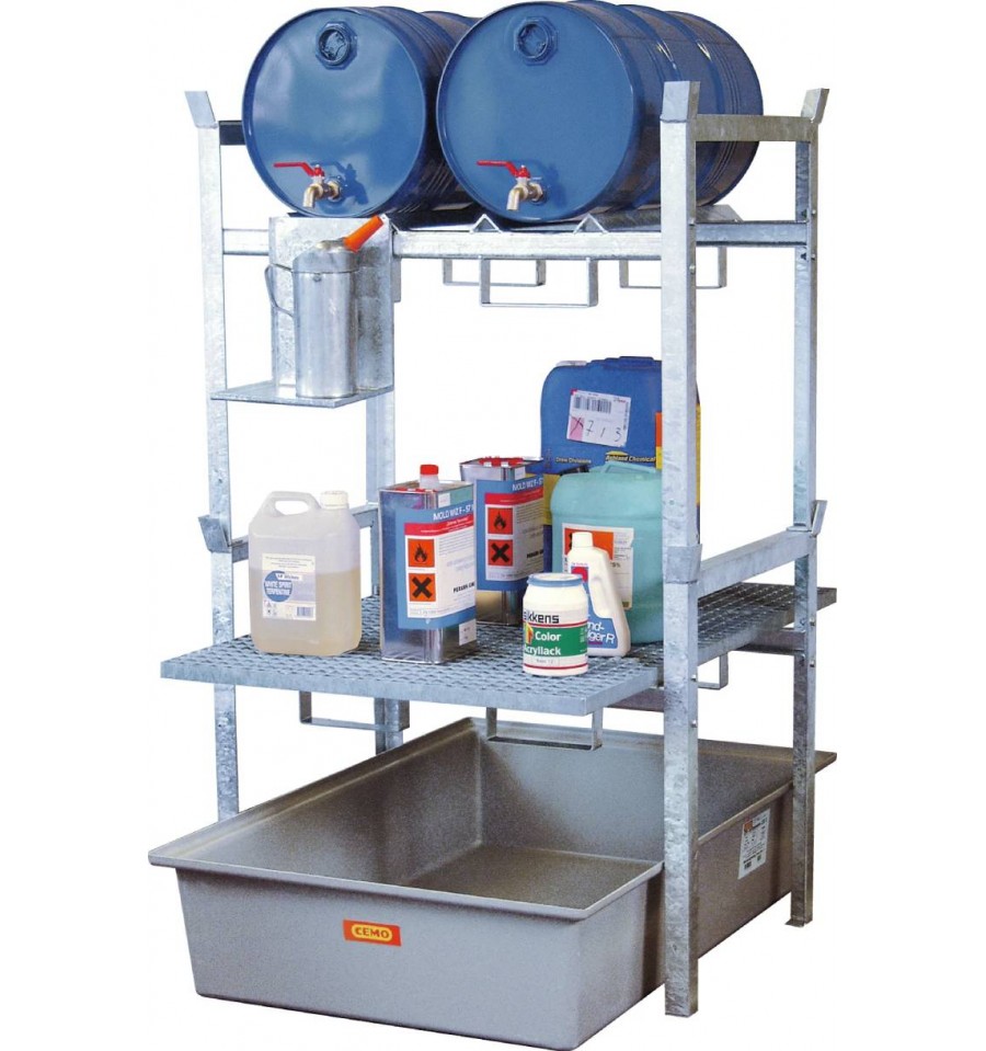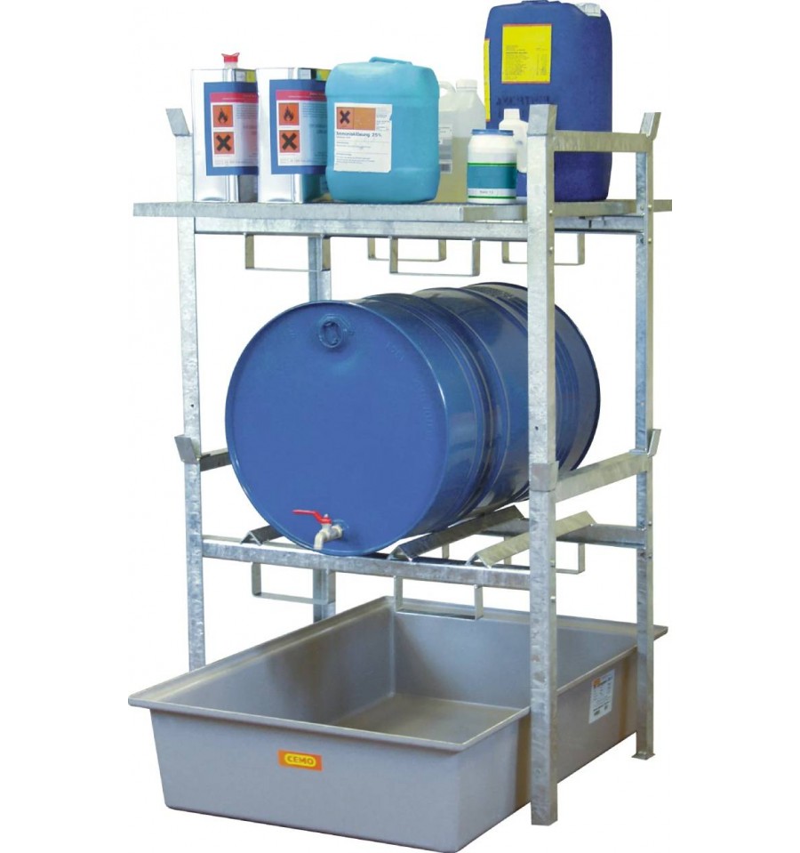 Wariant ten wyposażony jest w podporę do składowania 2 beczek 60 l lub 1 beczki 200 l oraz dodatkową kratę pomostową (gitterrost) przeznaczoną do ustawiania małych pojemników. Niska wysokość konstrukcji ułatwia codzienną obsługę, a możliwość bezpośredniego napełniania nad wystającą wanną wychwytową zwiększa funkcjonalność stanowiska. Regał dostarczany jest w częściach do samodzielnego montażu.