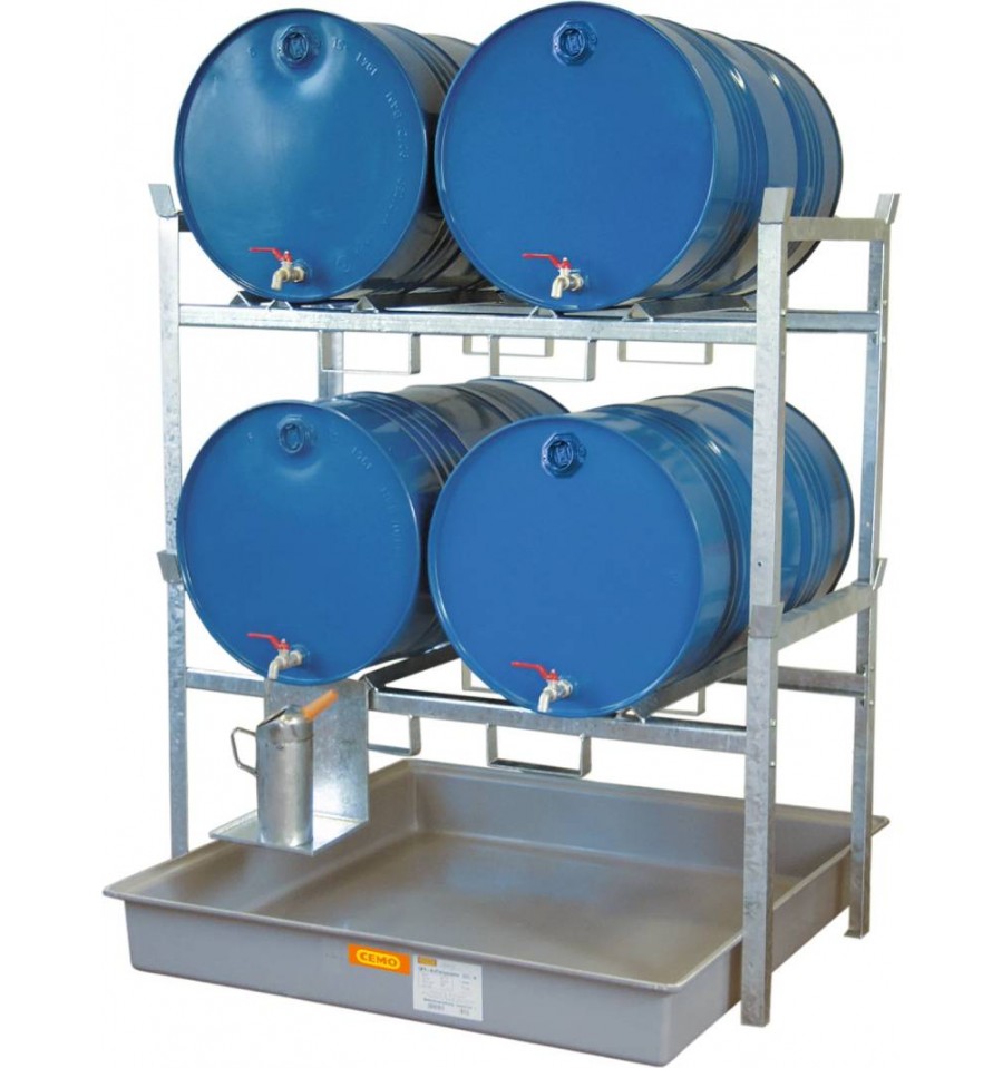 Regał umożliwia bezpieczne składowanie do 4 beczek 200 l na 2 poziomach (po 2 beczki na poziom). Niska wysokość konstrukcji ułatwia codzienną obsługę, a możliwość bezpośredniego napełniania nad wystającą wanną wychwytową zwiększa funkcjonalność. Dostarczany jest w częściach do samodzielnego montażu.