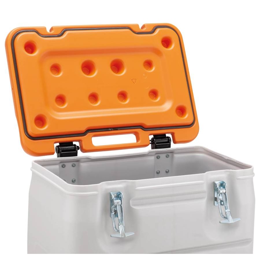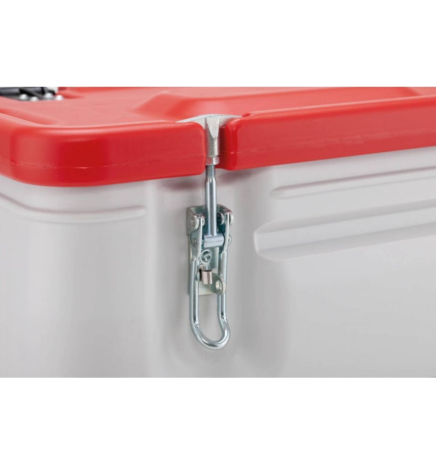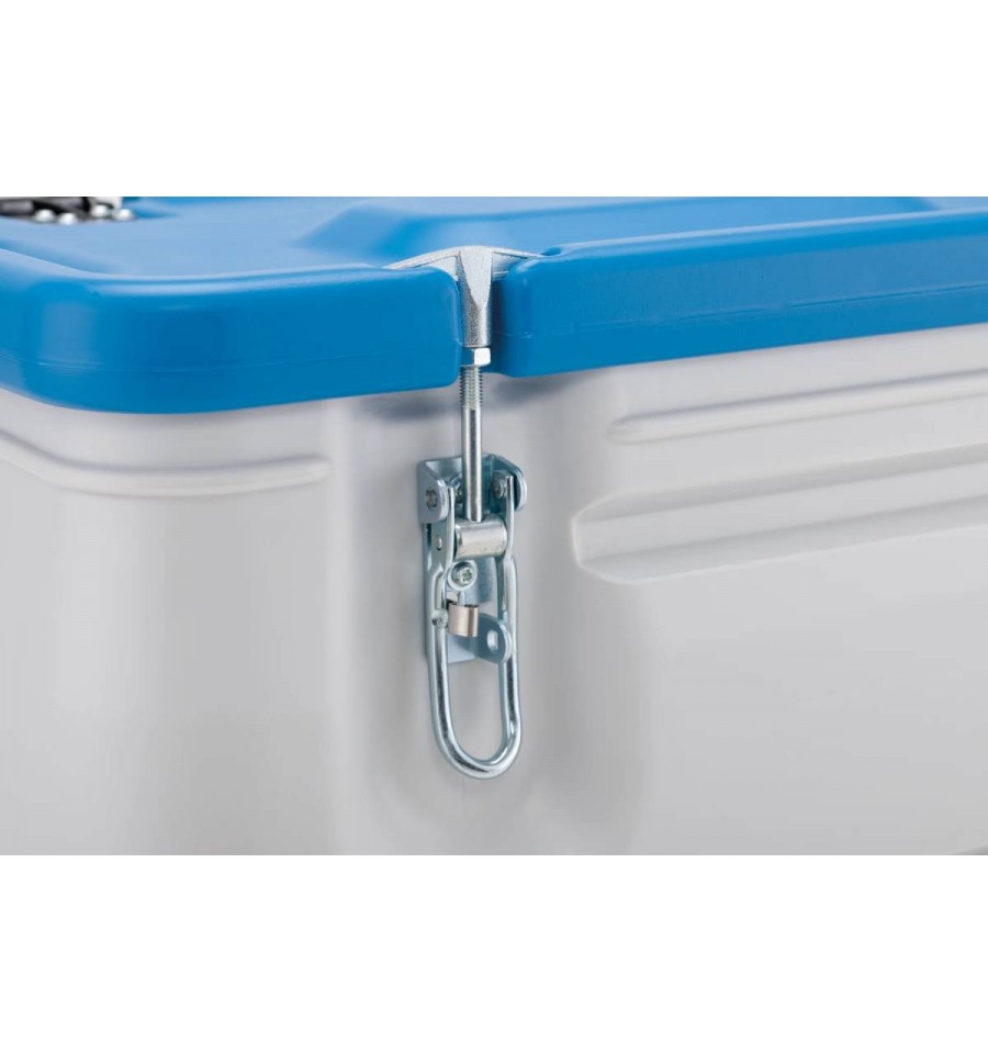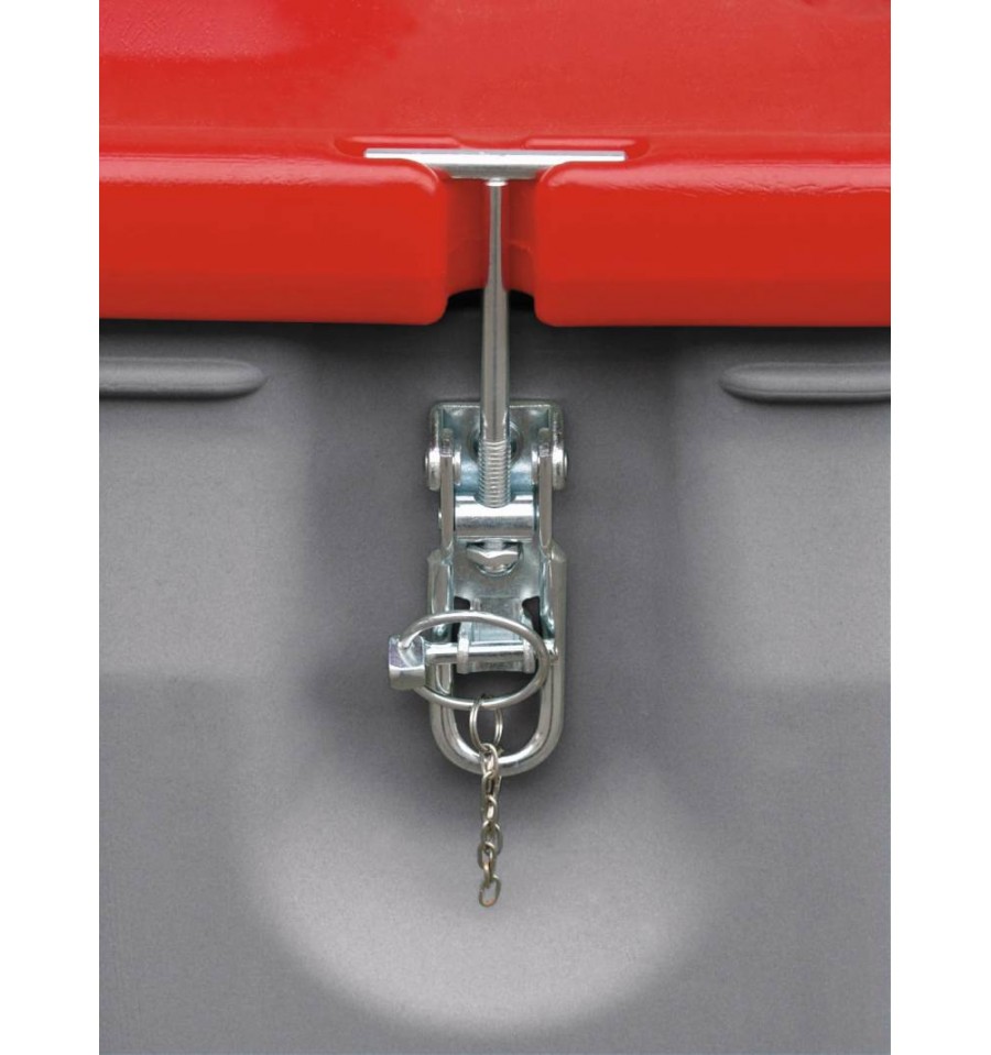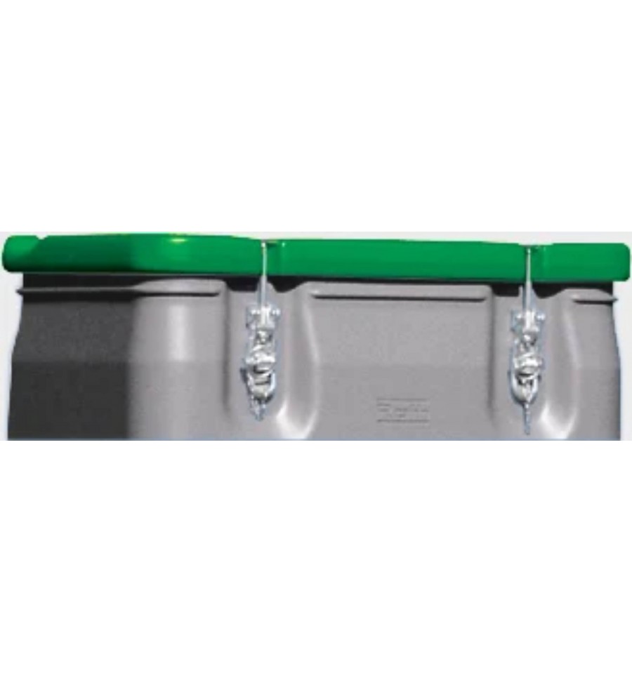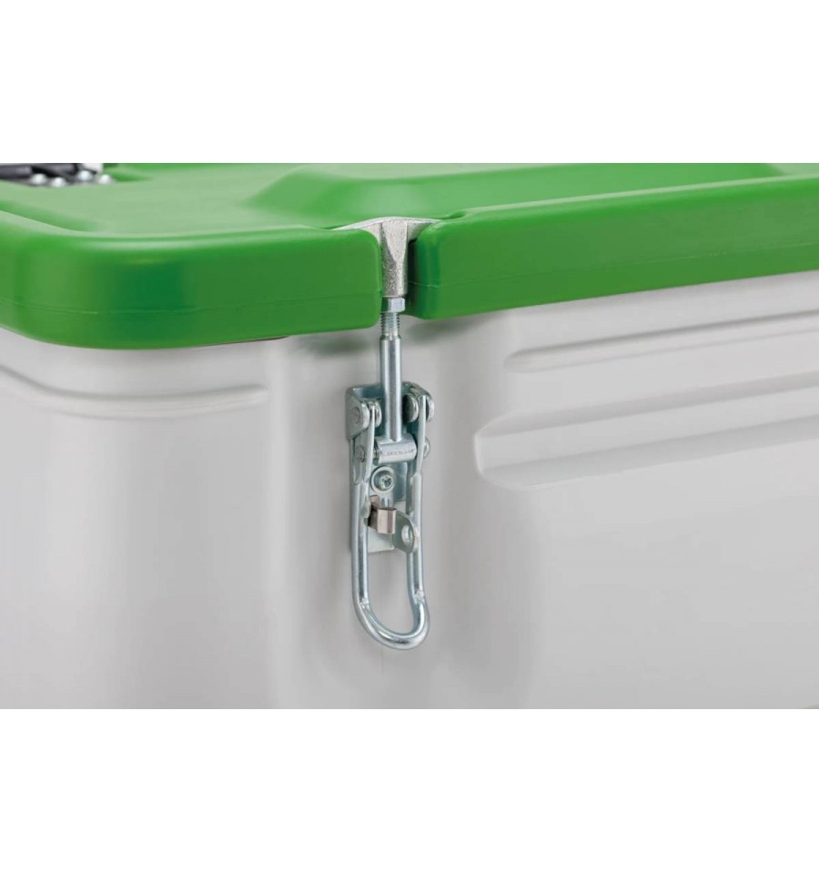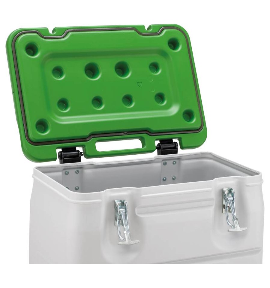 Specjalnie ukształtowana pokrywa umożliwia dwuwarstwowe składowanie – do 8 pojemników na palecie euro. Solidna konstrukcja zapewnia łatwą obsługę nawet przy pełnym załadunku, a przetłoczenia w ścianach ułatwiają opróżnianie przy użyciu wózka z obrotnicą. Pojemnik dostarczany jest w stanie zmontowanym i wyposażony w pokrywę zamykaną mechanizmem z metalową klamrą.