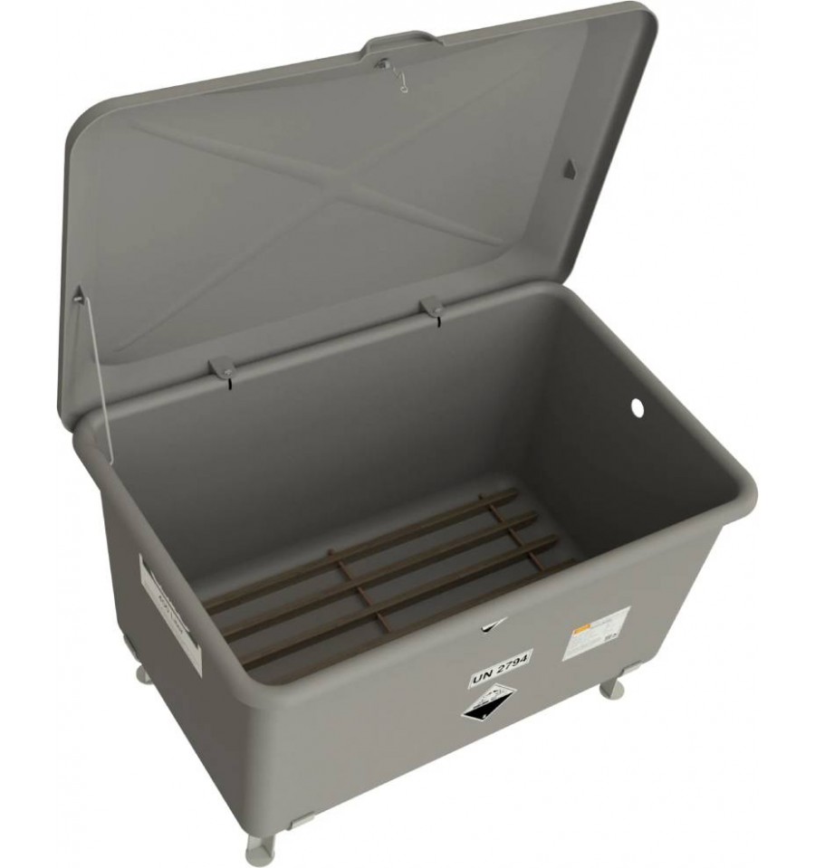 Wykonany z wytrzymałego tworzywa wzmacnianego włóknem szklanym (GFK) pojemnik przeznaczony jest do bezpiecznego magazynowania zużytych akumulatorów samochodowych. Zaprojektowany został z myślą o przechowywaniu oraz transporcie baterii zgodnie z obowiązującymi przepisami ADR 4.1.4.1 P801a. Dzięki solidnej konstrukcji zapewnia czyste i bezpieczne warunki składowania oraz chroni otoczenie przed wyciekiem niebezpiecznych substancji.