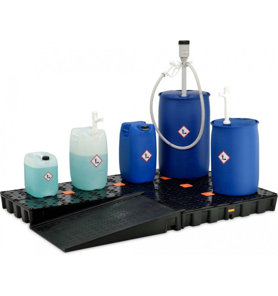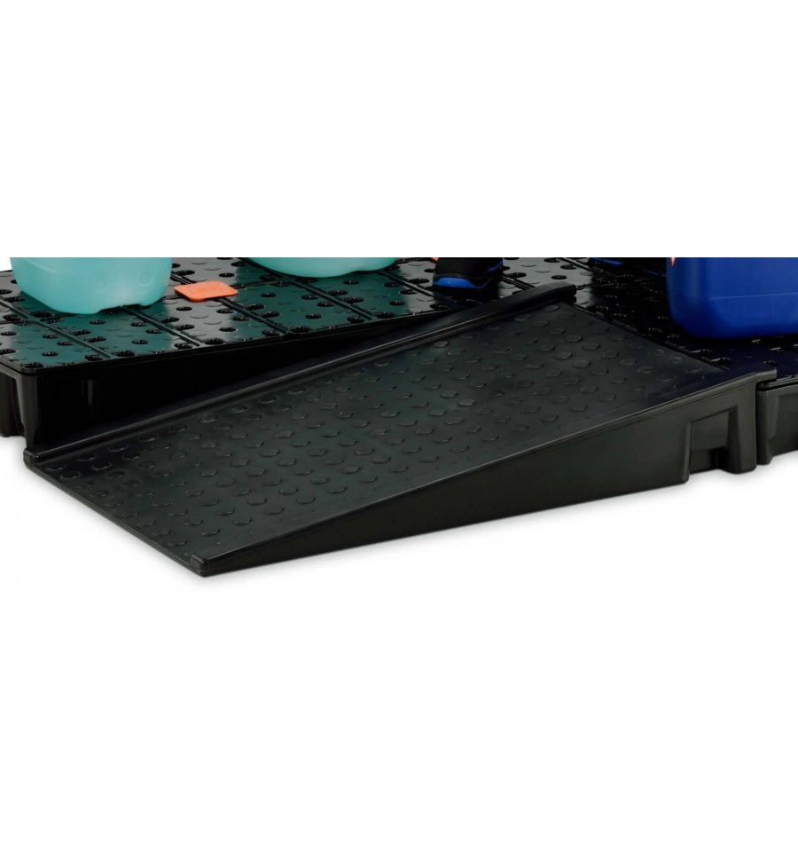 Rampa została zaprojektowana do współpracy z elementami systemów ochrony powierzchni PE, w tym z wannami wychwytowymi wyposażonymi w ruszt. Zintegrowane bolce mocujące umożliwiają stabilne połączenie rampy z rusztem, co zapewnia bezpieczny załadunek i rozładunek beczek, pojemników oraz innych ciężkich ładunków.