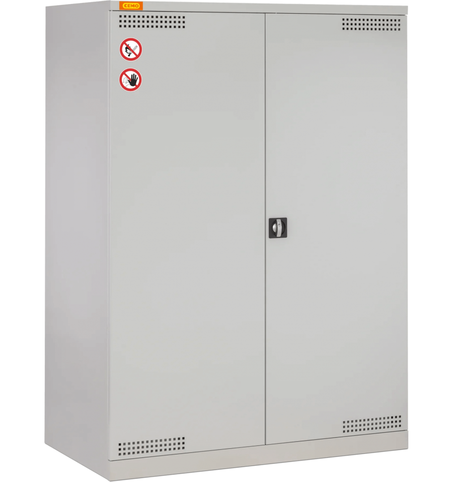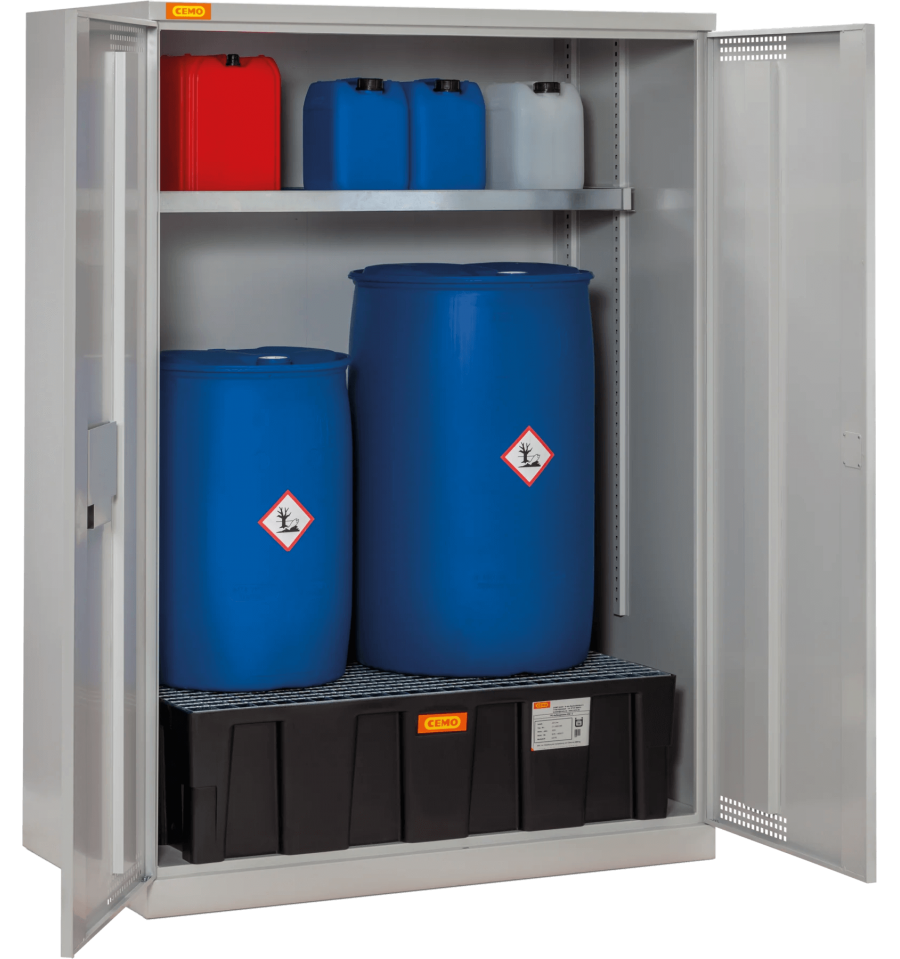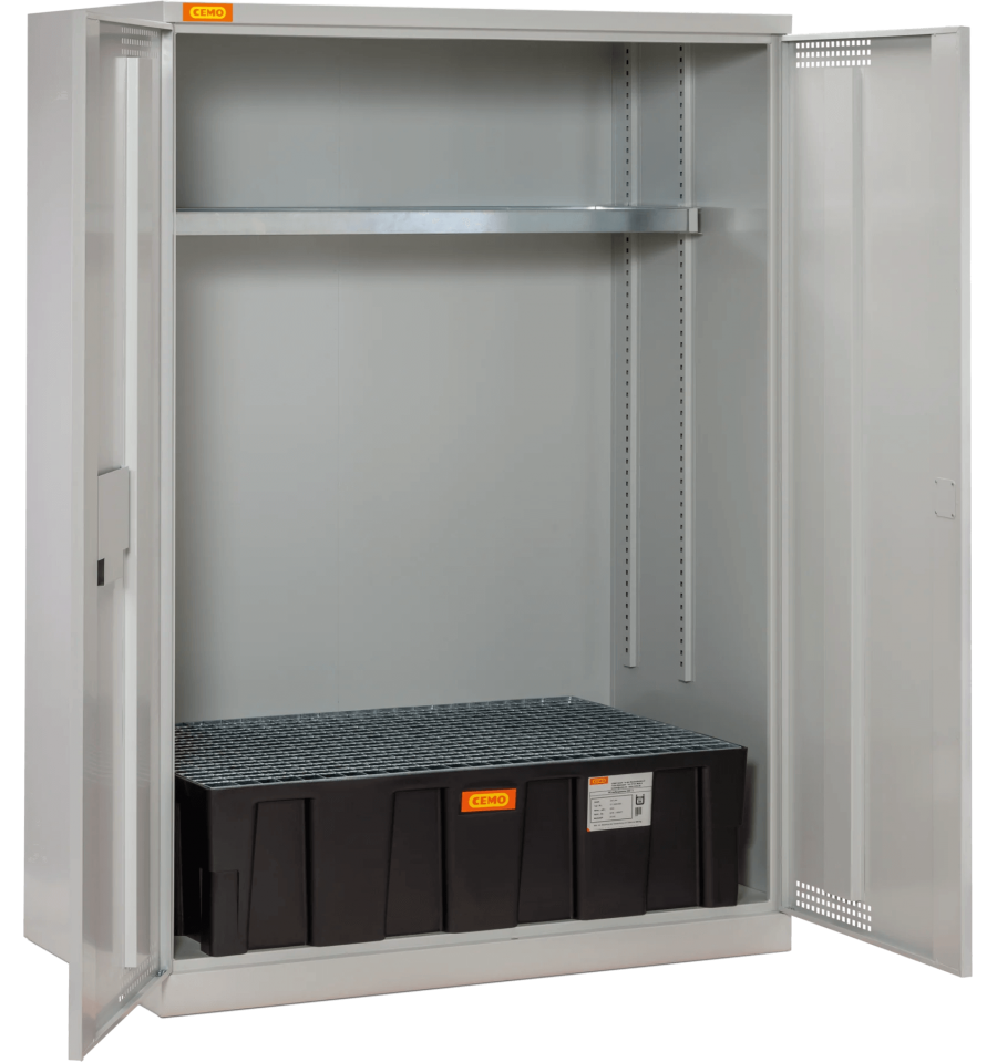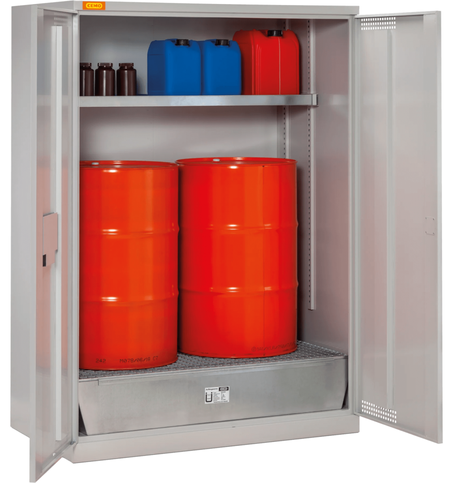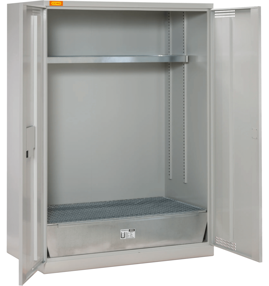 Szafa wyposażona jest w zbiornik wychwytowy o dużej pojemności oraz ruszt, który wspiera pojemniki i jednocześnie zapewnia efektywną ochronę przed wyciekami; dodatkowa góra z tacą pozwala na umieszczanie mniejszych pojemników. Wentylowane drzwi z możliwością podłączenia systemu zewnętrznej wentylacji, zamek cylindryczny oraz kieszeń na dokumenty zwiększają bezpieczeństwo i funkcjonalność. Wysokiej jakości powłoka proszkowa w kolorze szarym oraz solidna stalowa konstrukcja gwarantują długotrwałą ochronę i odporność na intensywne użytkowanie w trudnych warunkach.