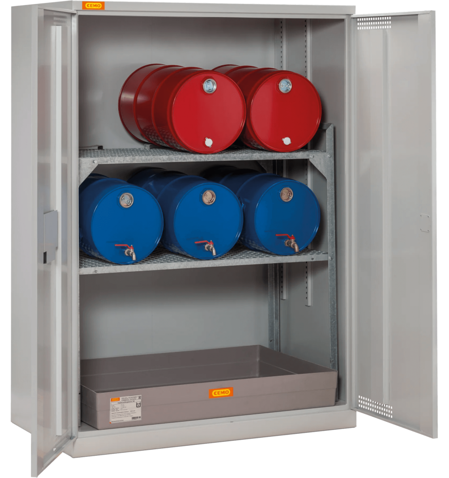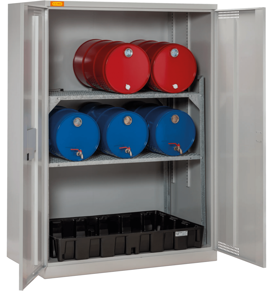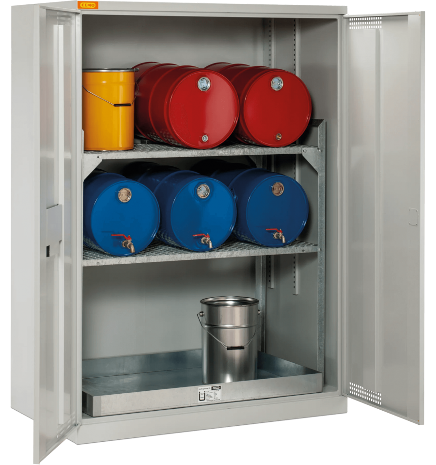Zintegrowany stalowy zbiornik wychwytowy o dużej pojemności, w połączeniu z wytrzymałą konstrukcją, chroni podłoże przed zanieczyszczeniem i spełnia wymagania dotyczące ochrony środowiska. Wentylowane drzwi oraz możliwość podłączenia systemu wentylacji poprawiają bezpieczeństwo pracy, a zamek cylindryczny zabezpiecza dostęp do przechowywanych substancji. Trwała stalowa obudowa i odporna powłoka lakiernicza gwarantują długą żywotność nawet przy intensywnej eksploatacji.