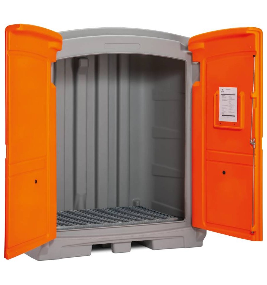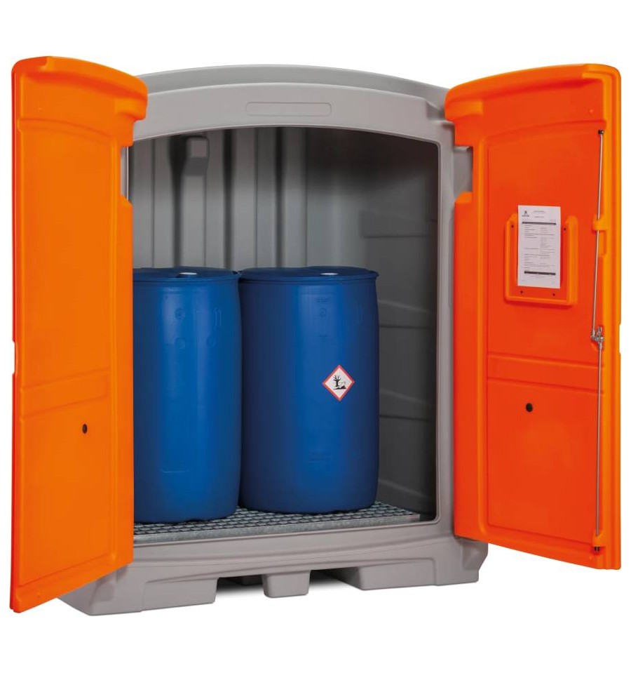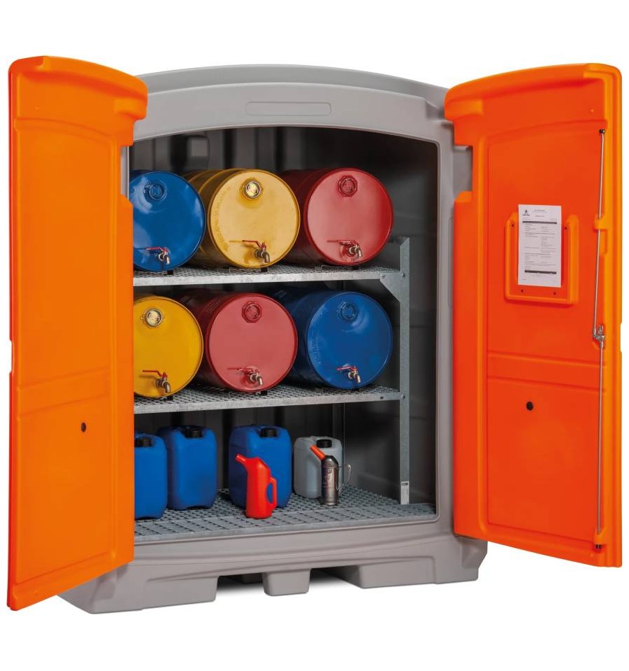 PE magazyn substancji niebezpiecznych 220 l to trwałe i certyfikowane rozwiązanie przeznaczone do bezpiecznego magazynowania substancji niebezpiecznych wewnątrz budynków oraz na zewnątrz. Konstrukcja wykonana jest z wysokiej jakości polietylenu (PE), charakteryzującego się bardzo wysoką odpornością chemiczną. Magazyn wyposażony jest w solidne, zamykane drzwi z ryglem ze stali nierdzewnej, które skutecznie chronią zawartość przed nieuprawnionym dostępem. Zintegrowana wanna wychwytowa o pojemności 220 l posiada dopuszczenie ogólnobudowlane DIBt (Z-40.22-591) i umożliwia bezpieczne składowanie substancji zagrażających wodom w klasach WGK 1–3. Produkt dostarczany jest w stanie w pełni zmontowanym i gotowym do natychmiastowego użycia.
