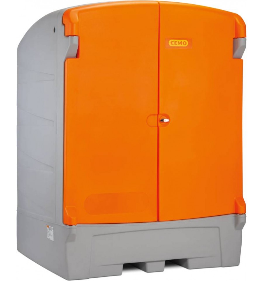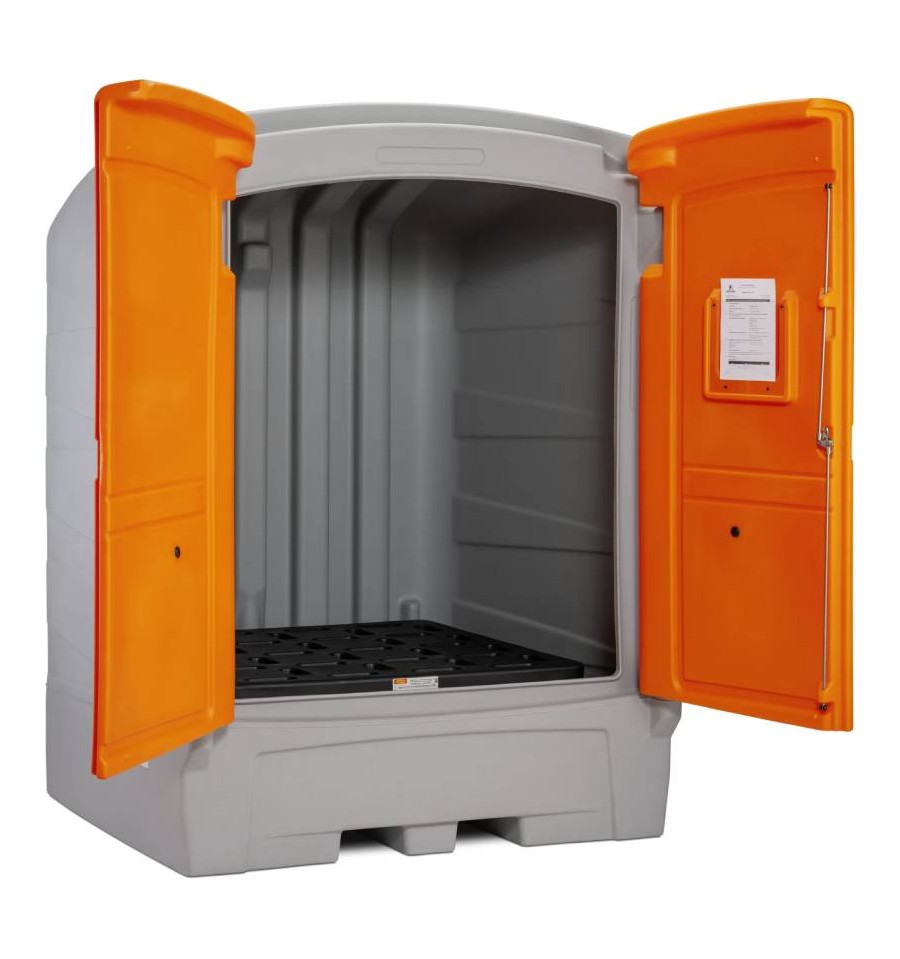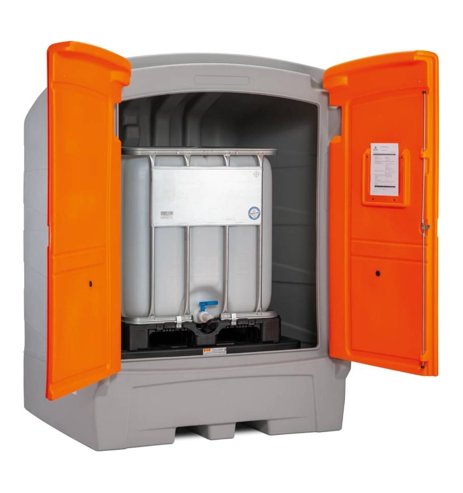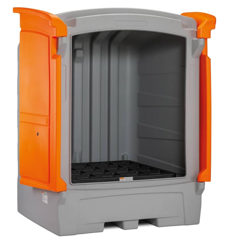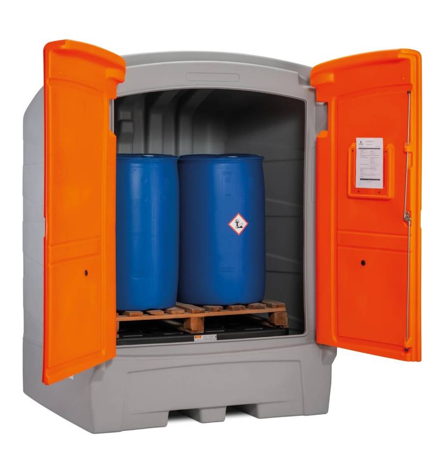 Magazyn wyposażony jest w zamykane drzwi ze stabilnym zamkiem prętowym ze stali nierdzewnej. Wewnętrzna strona drzwi posiada kieszeń na dokumenty. Konstrukcja umożliwia bezpośrednie ustawienie załadowanych palet lub pojemników IBC w depozycie (zintegrowane kieszenie na widły wózka). Drzwi otwierają się do 270° przy ustawieniu pojedynczym (ok. 180° przy ustawieniu w rzędzie) i posiadają blokadę w rastrze 90°. Zintegrowana wanna wychwytowa o pojemności 1100 l posiada dopuszczenie DIBt Z-40.22-591. Produkt dostarczany jest w stanie w pełni zmontowanym.