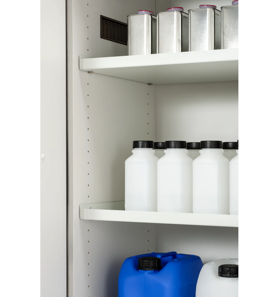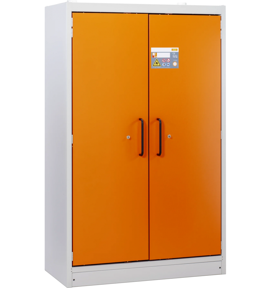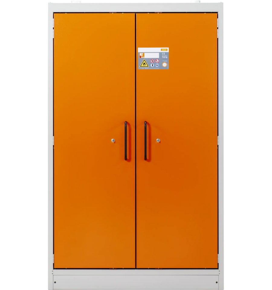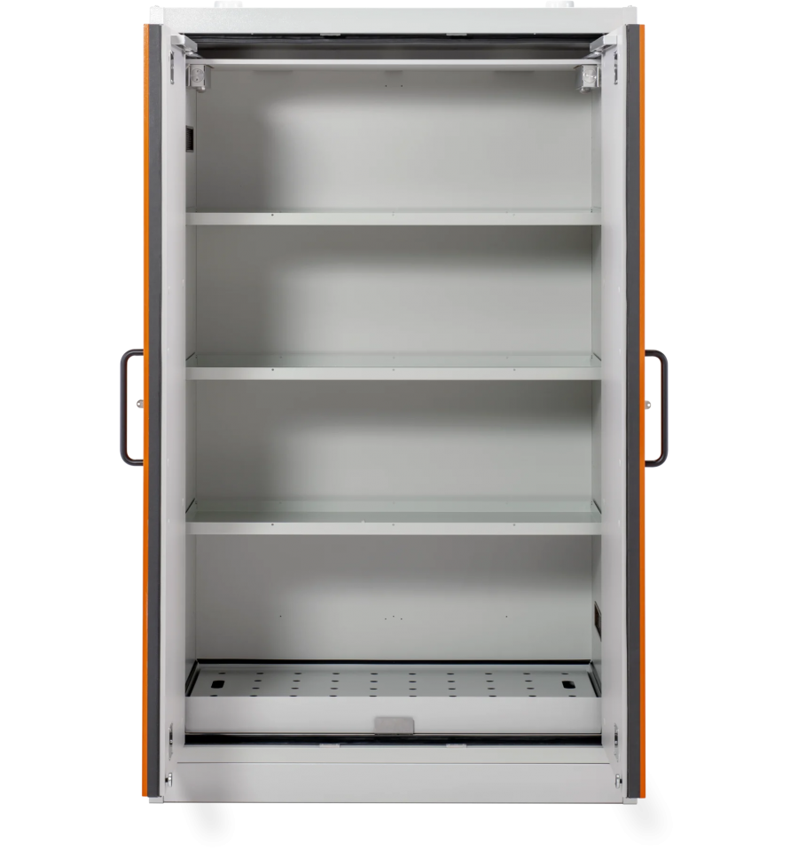 Dzięki konstrukcji ze stali oraz uszczelnieniom zapewnia 90 minut ochrony w przypadku pożaru. Szafa jest wyposażona w trzy wyjmowane półki ociekowe oraz perforowaną misę wychwytową, które umożliwiają przechowywanie pojemników do 30 l (lub zgodnie z wariantami do 60 l). Drzwi zamykają się automatycznie w razie pożaru, a zamek dwupunktowy włącza się już po zamknięciu skrzydeł, co zwiększa ochronę przed nieautoryzowanym dostępem.