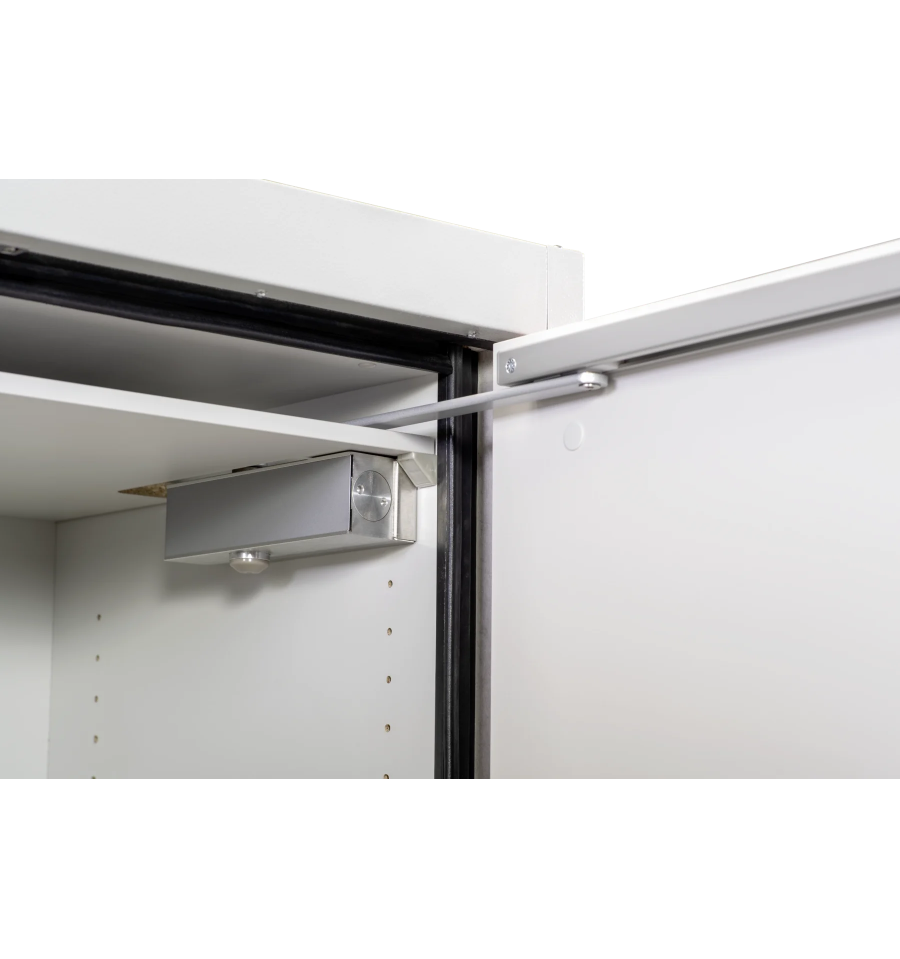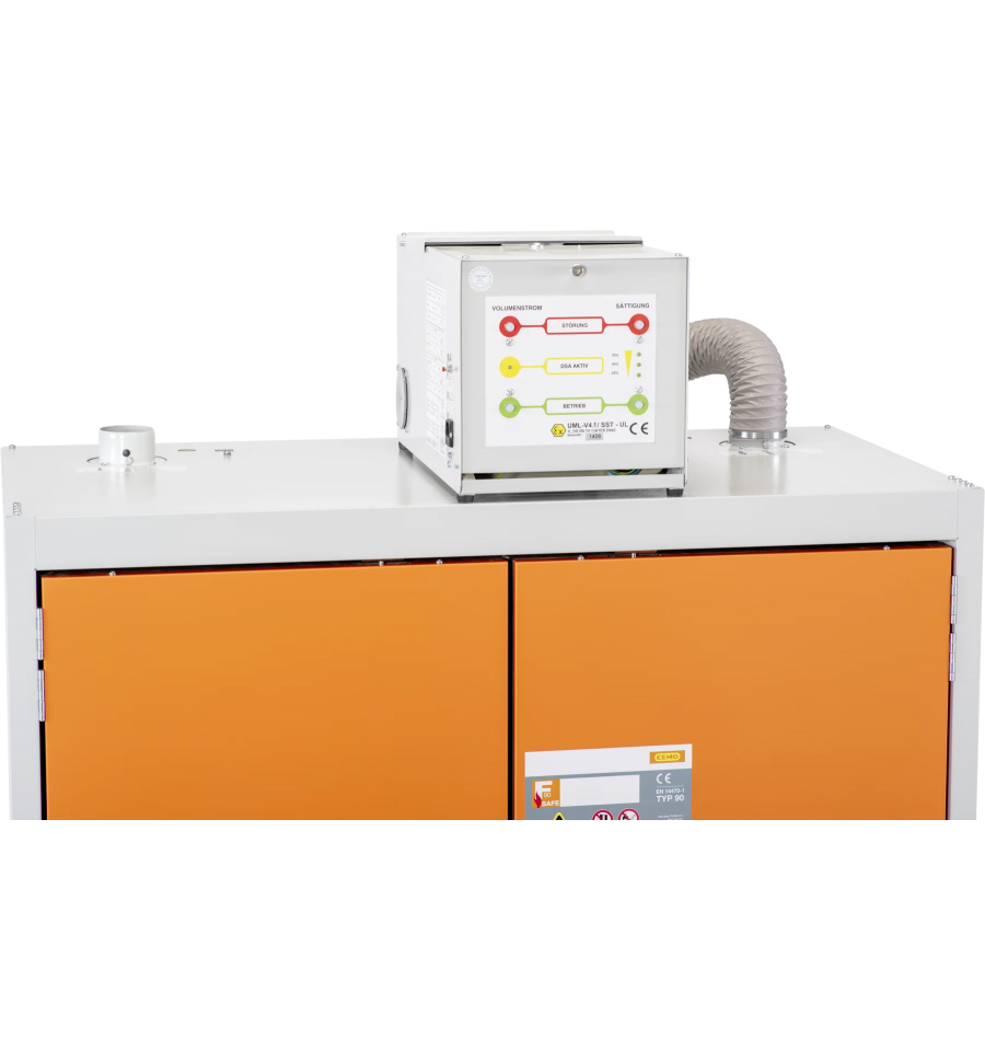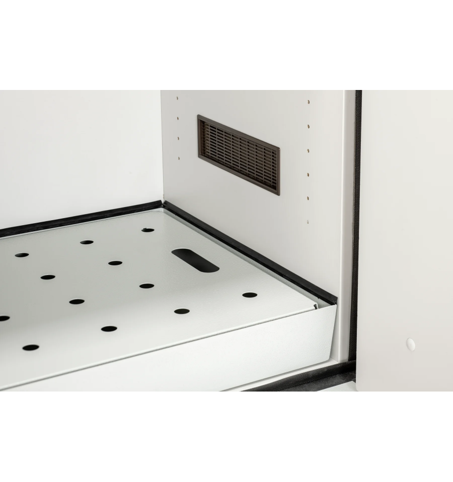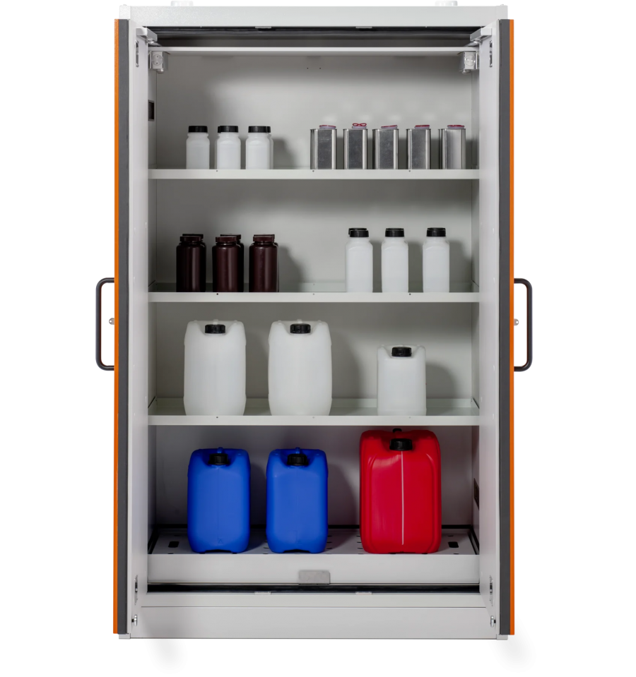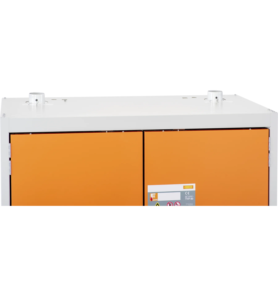 Dzięki konstrukcji ze stali oraz uszczelnieniom zapewnia 90 minut ochrony w przypadku pożaru. Szafa jest wyposażona w trzy wyjmowane półki ociekowe oraz perforowaną misę wychwytową, które umożliwiają przechowywanie pojemników do 30 l (lub zgodnie z wariantami do 60 l). Drzwi zamykają się automatycznie w razie pożaru, a zamek dwupunktowy włącza się już po zamknięciu skrzydeł, co zwiększa ochronę przed nieautoryzowanym dostępem.