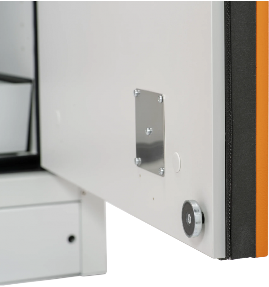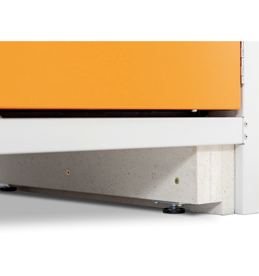 Dodatkowo, szafa posiada możliwość podłączenia do wentylacji (otwór DN75), możliwość uziemienia zewnętrznego dla ochrony przed iskrami oraz demontowalną dolną obudowę, co pozwala na transport wózkiem widłowym. Regulowane nóżki umożliwiają dokładne poziomowanie, a kolorystyka (szara obudowa / drzwi w kolorze RAL 2008) zapewnia dobrą widoczność i identyfikację.