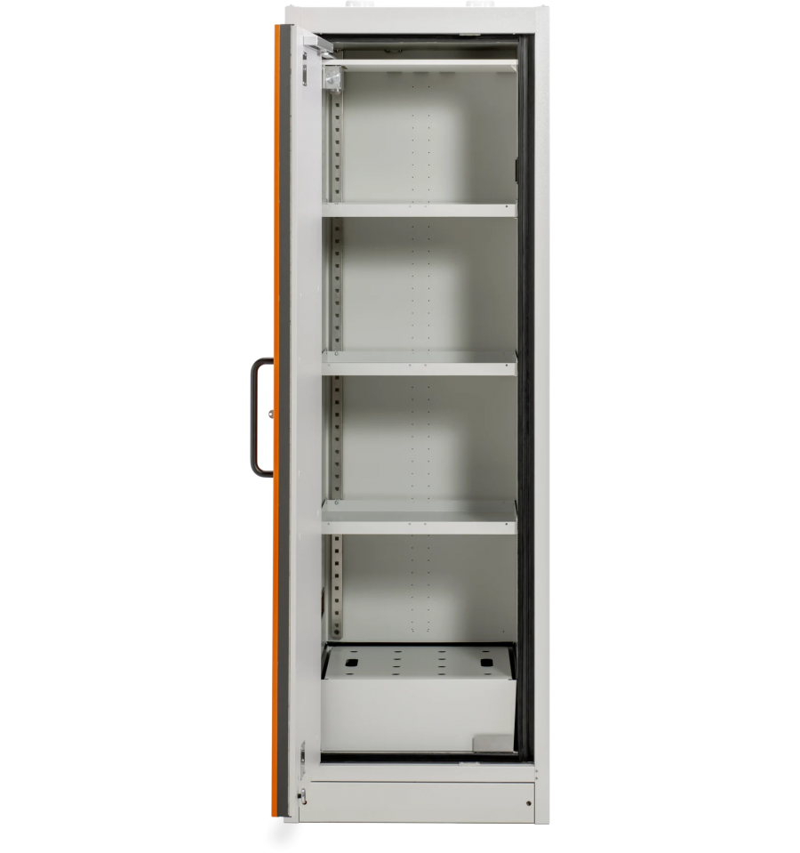 Ogniotrwała i bezpieczna szafa CEMO PROline 6/20 Typ 90 zapewnia 90-minutową ochronę ogniową zgodnie z normą DIN EN 14470-1. Posiada trzy regulowane półki ociekowe oraz perforowaną misę dolną do przechowywania substancji niebezpiecznych. Drzwi zamykają się automatycznie w razie pożaru, a dwupunktowy zamek blokujący włącza się po ich zamknięciu. Szafa umożliwia podłączenie do systemu wentylacji i ma punkt uziemienia, by zapobiec ryzyku wyładowań elektrostatycznych.
