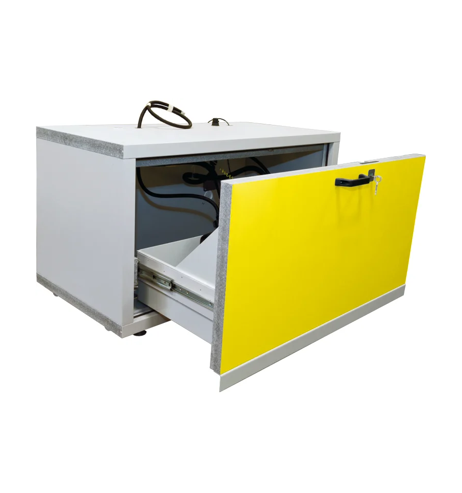 Konstrukcja wyposażona jest w system samoczynnego zamykania wentylacji przy pożarze, uziemienie oraz regulowane nóżki. Kompaktowe wymiary sprawiają, że szafa doskonale nadaje się do laboratoriów, warsztatów i pomieszczeń roboczych. Połączenie podblatowej konstrukcji i 90-cio minutowej odporności ogniowej jest niewątpliwie unikatowym rozwiązaniem. Szafa posiada certyfikaty GS oraz CE, jest zgodna z normą EN 14470-1.