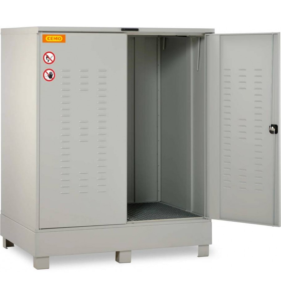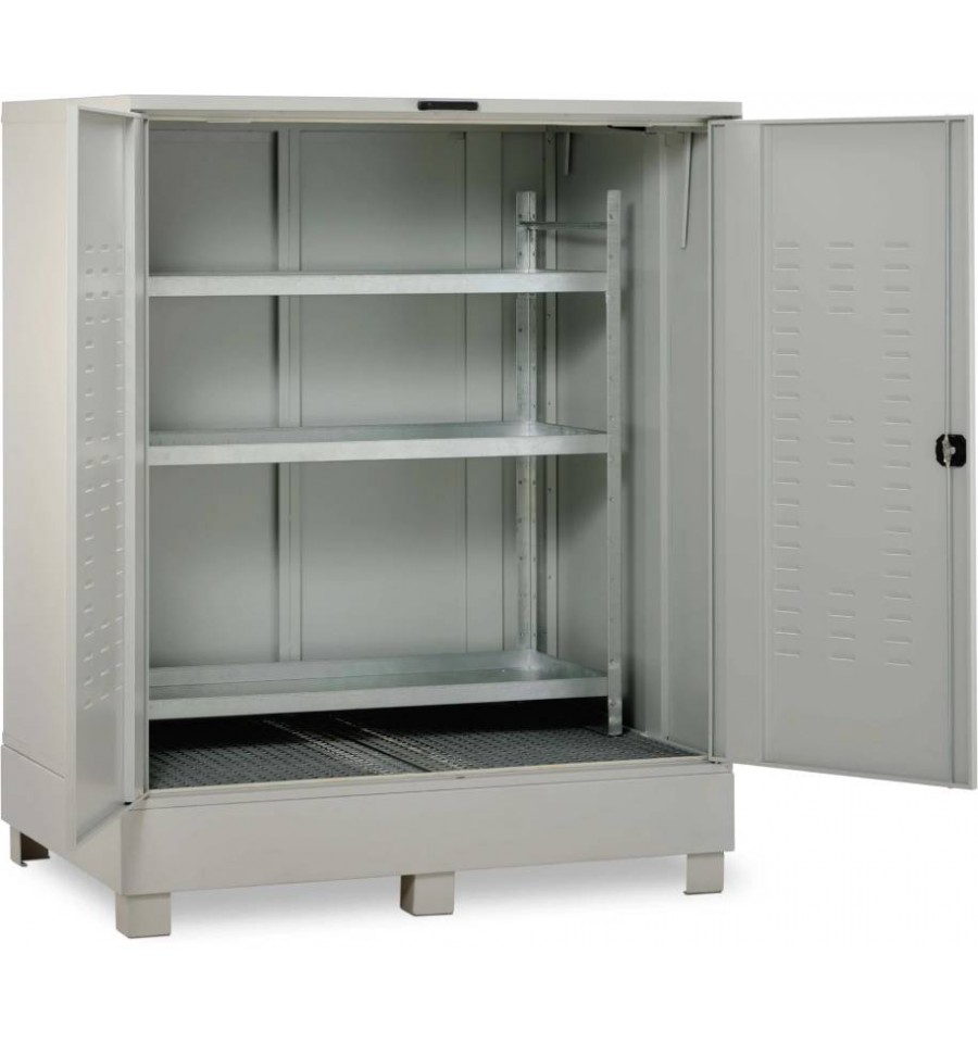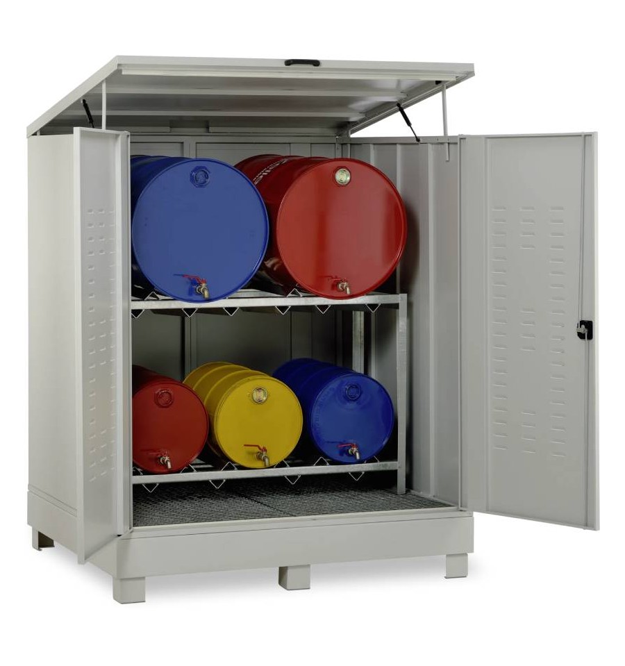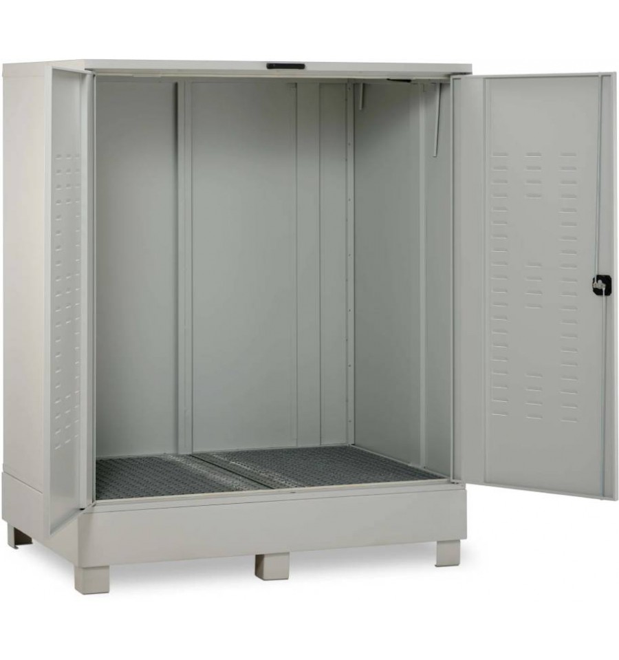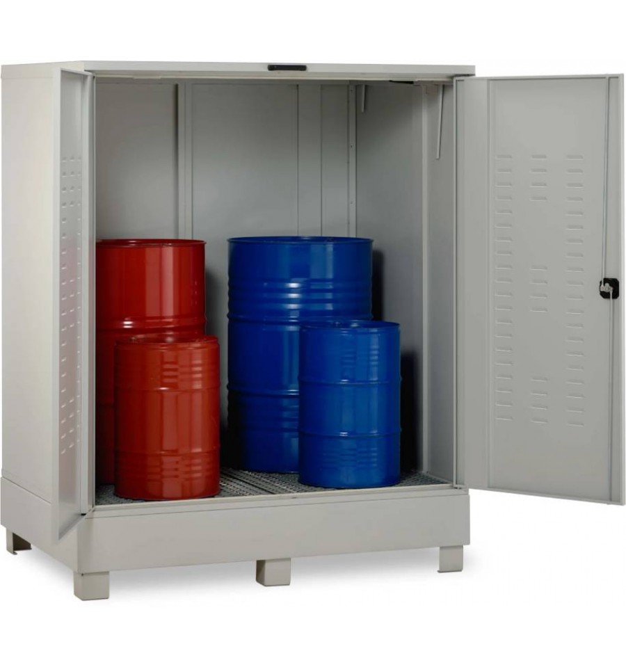 Otwory wentylacyjne w drzwiach umożliwiają naturalną cyrkulację powietrza, a zamykane drzwi skutecznie chronią zawartość przed dostępem osób nieupoważnionych. Zintegrowana wanna wychwytowa posiada dopuszczenie zgodne z niemieckimi przepisami StawaR i zabezpiecza podłoże przed ewentualnymi wyciekami substancji wodno-zagrażających oraz cieczy łatwopalnych. Produkt dostarczany jest w stanie w pełni zmontowanym i gotowym do użycia.