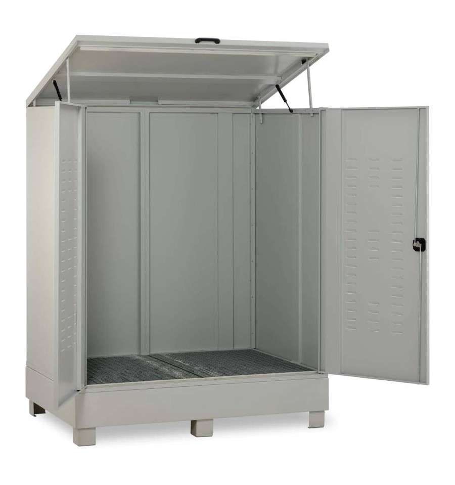 Stalowy depozyt chemikaliów 320 l to solidne i certyfikowane rozwiązanie do bezpiecznego magazynowania substancji niebezpiecznych, przeznaczone do użytkowania na zewnątrz. Konstrukcja wykonana jest ze stali ocynkowanej z trwałą, odporną na warunki atmosferyczne powłoką proszkową w kolorze szarym (zbliżonym do RAL 7035). Drzwi wyposażone w otwory wentylacyjne zapewniają naturalną cyrkulację powietrza, a możliwość zamknięcia na zamek skutecznie chroni zawartość przed nieuprawnionym dostępem. Zintegrowana wanna wychwytowa posiada dopuszczenie zgodne z niemieckimi przepisami StawaR, umożliwiając bezpieczne składowanie cieczy łatwopalnych oraz substancji zagrażających wodom (WGK 1–3). Produkt dostarczany jest w stanie w pełni zmontowanym i gotowym do natychmiastowego użycia.