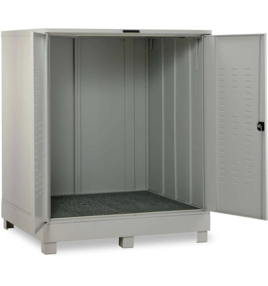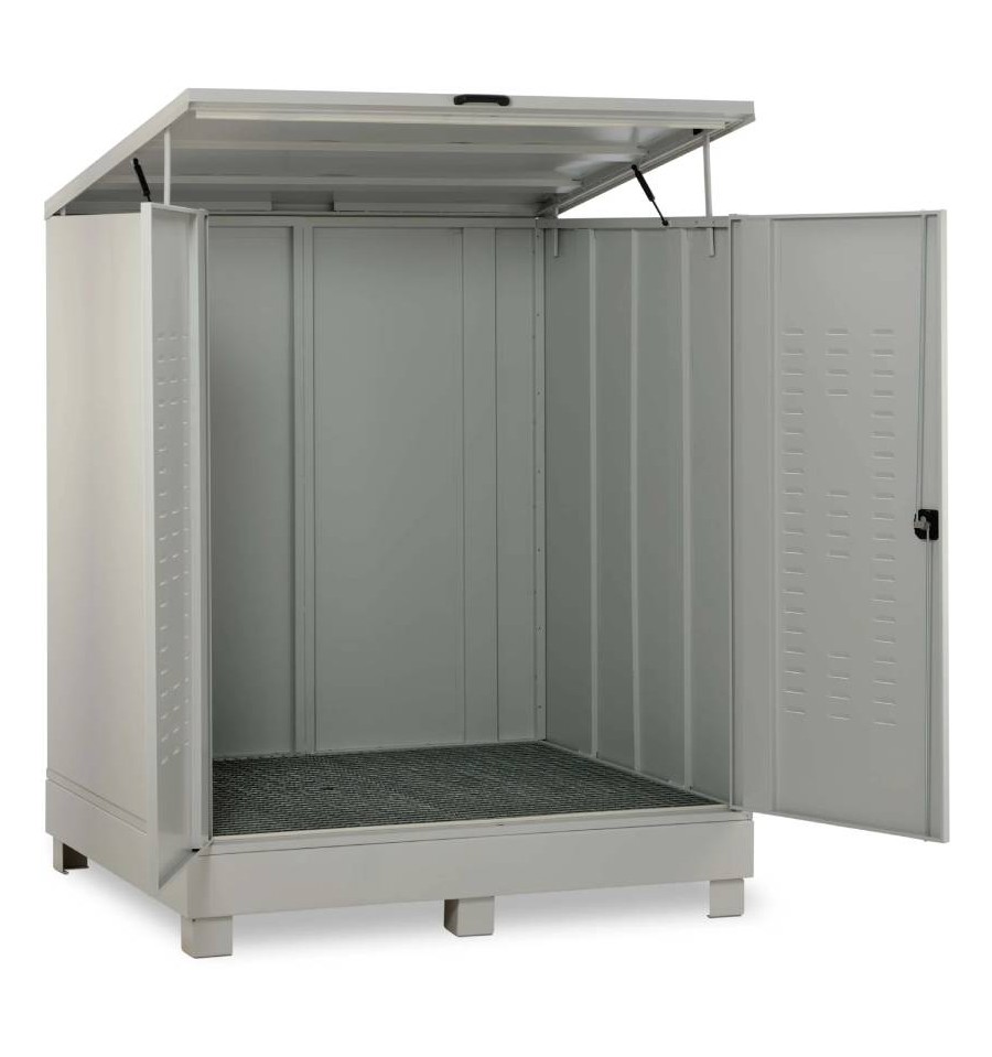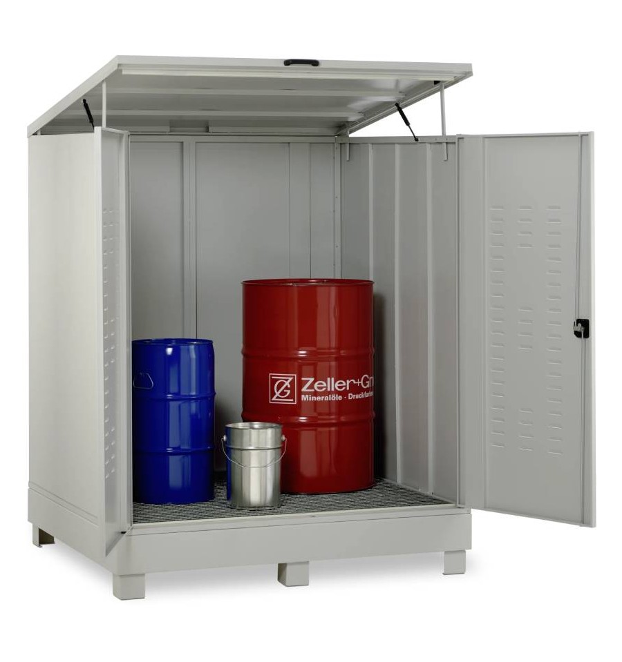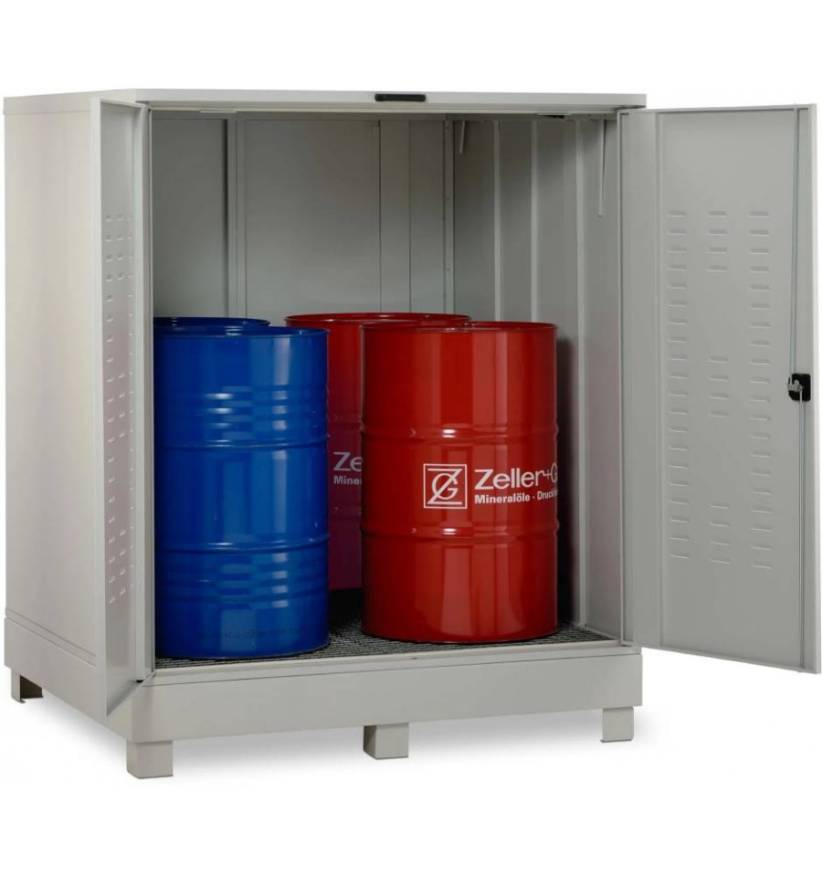 Stalowy depozyt substancji niebezpiecznych 400 l to wytrzymałe i certyfikowane rozwiązanie przeznaczone do bezpiecznego magazynowania substancji niebezpiecznych na zewnątrz budynków. Konstrukcja wykonana jest ze stali ocynkowanej, zabezpieczonej trwałą, odporną na warunki atmosferyczne powłoką proszkową w kolorze szarym. Drzwi wyposażone w szczeliny wentylacyjne zapewniają naturalną cyrkulację powietrza, a możliwość zamknięcia na zamek skutecznie chroni zawartość przed nieuprawnionym dostępem. Zintegrowana wanna wychwytowa posiada dopuszczenie zgodne z niemieckimi przepisami StawaR, umożliwiając bezpieczne składowanie cieczy łatwopalnych (H224–H226) oraz substancji zagrażających wodom (WGK 1–3). Produkt dostarczany jest w stanie w pełni zmontowanym i gotowym do natychmiastowego użycia.