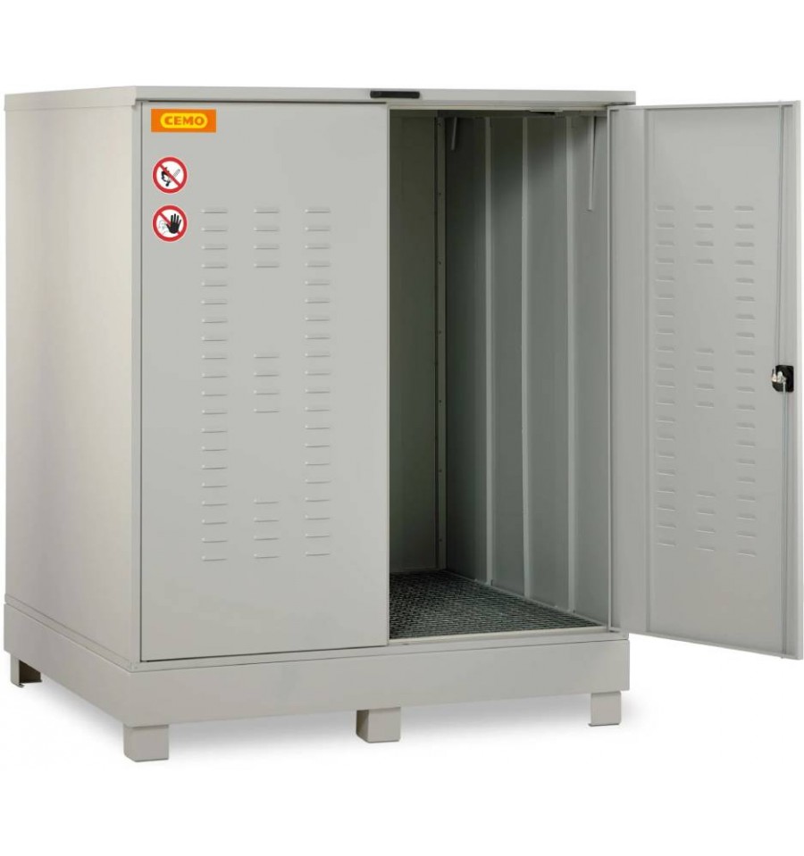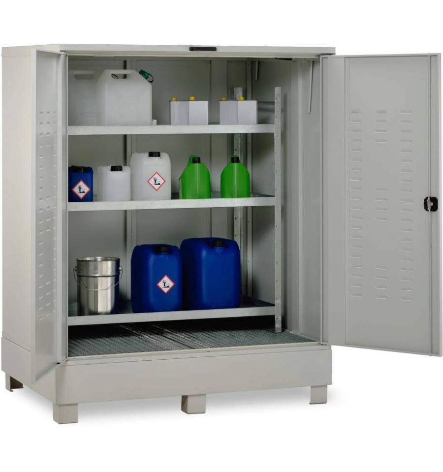 Otwory wentylacyjne w drzwiach umożliwiają naturalną cyrkulację powietrza, a zamykane drzwi skutecznie chronią zawartość przed dostępem osób nieupoważnionych. Zintegrowana wanna wychwytowa posiada dopuszczenie zgodne z niemieckimi przepisami StawaR i zabezpiecza podłoże przed ewentualnymi wyciekami substancji wodno-zagrażających (WGK 1–3) oraz cieczy łatwopalnych (H224–H226). Produkt dostarczany jest w stanie w pełni zmontowanym i gotowym do użycia.