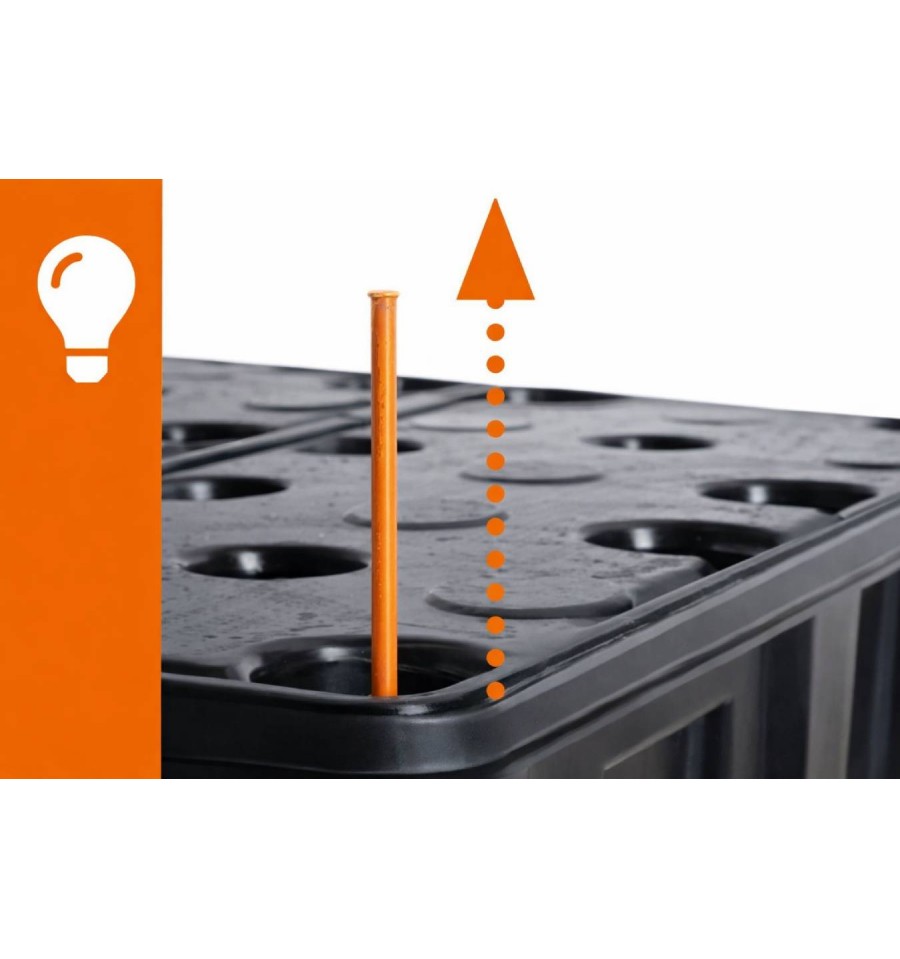 Wersja z polietylenową kratownicą wyposażona jest w ważną funkcję bezpieczeństwa czyli wizualny wskaźnik wycieku. Jeśli płyn niezauważenie wycieknie do wanny ociekowej, wizualny wskaźnik wycieku będzie swobodnie unosić się i stanie się widoczny.