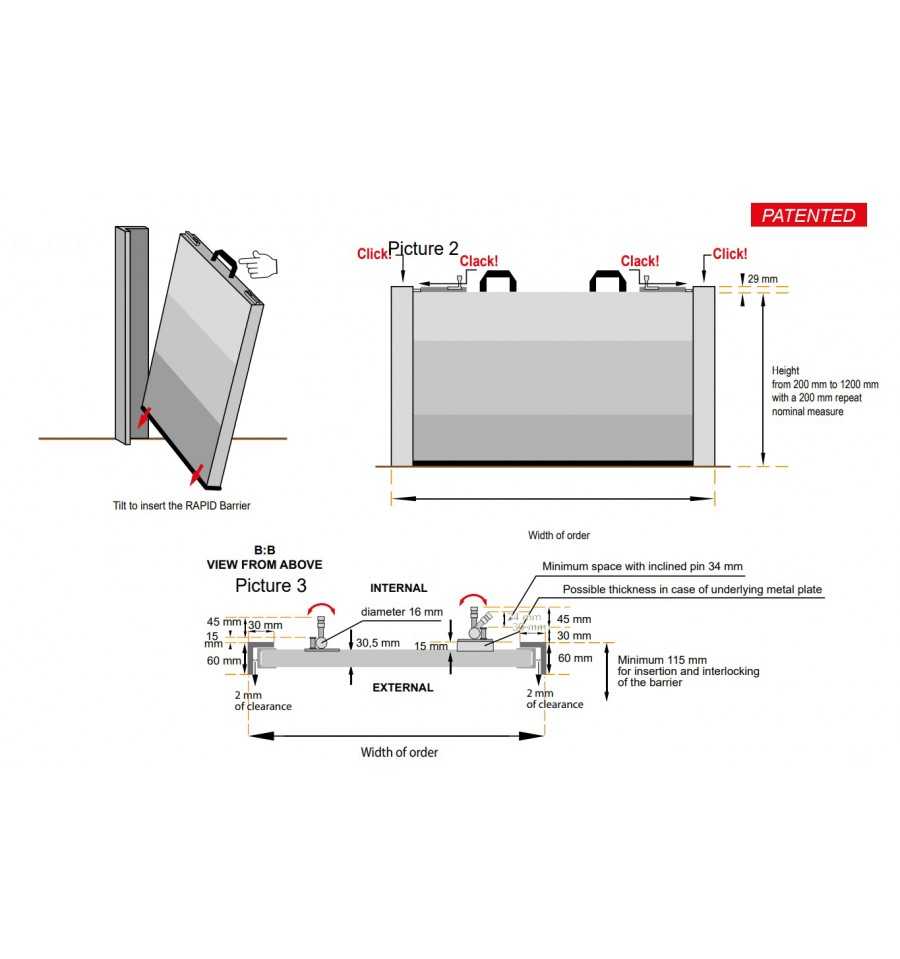Dzięki innowacyjnemu systemowi click Block, jednym ruchem bariera RAPID znajduje się pod ciśnieniem i ustawia się w ciągu kilku sekund. Jest standardowo dostarczany z boczną hydrauliczną szczelnością i profilami mocującymi, które gwarantują doskonałe uszczelnienie i umożliwiają regulację wszelkich nierówności w komorze. Wykonane z lekkich materiałów, specjalne narożne profile mocujące działają jak hydrauliczne uszczelnienie dociskowe, umożliwiając podniesienie bariery o zaledwie 3 cm w celu umieszczenia jej w obudowie. Montaż nie wymaga wysiłku.